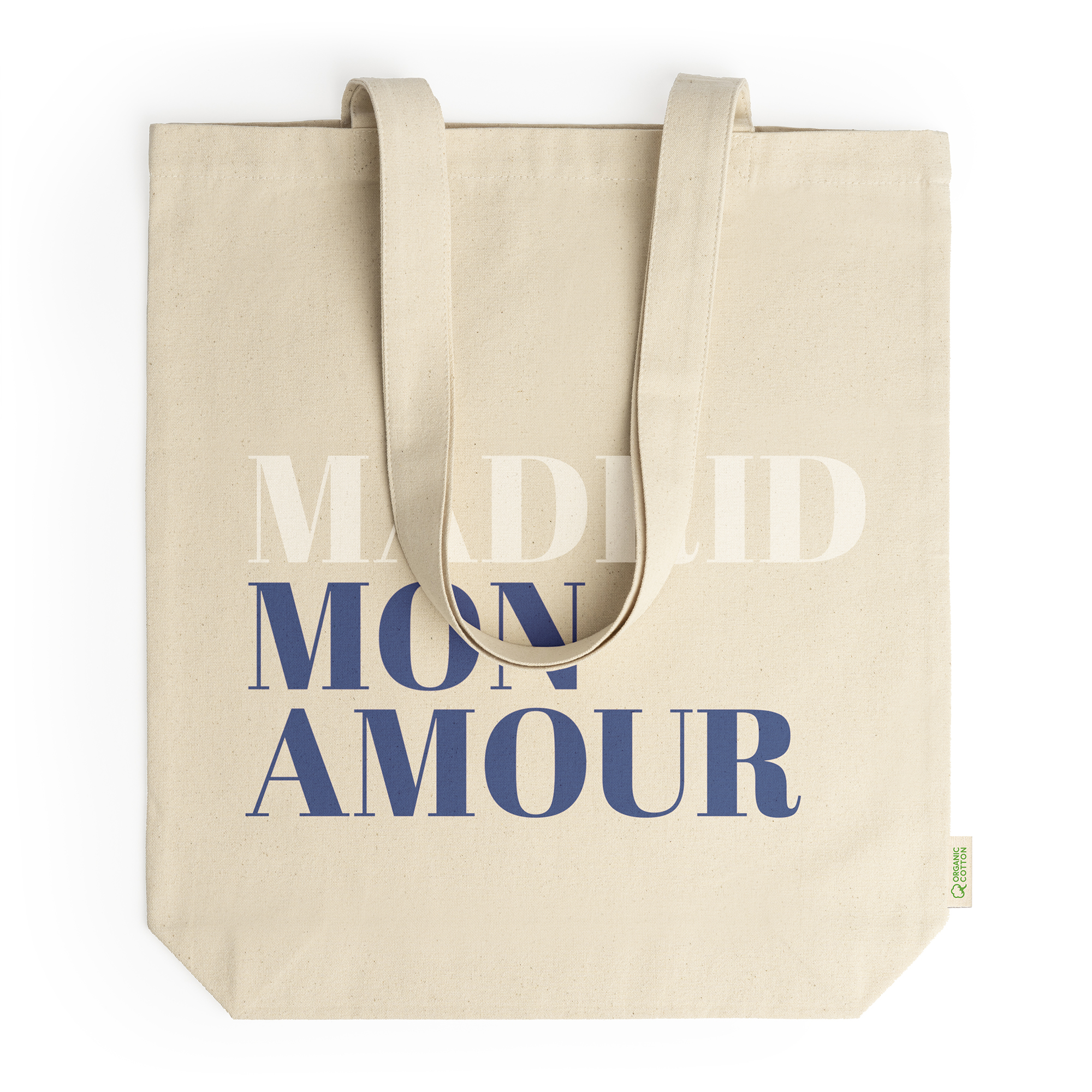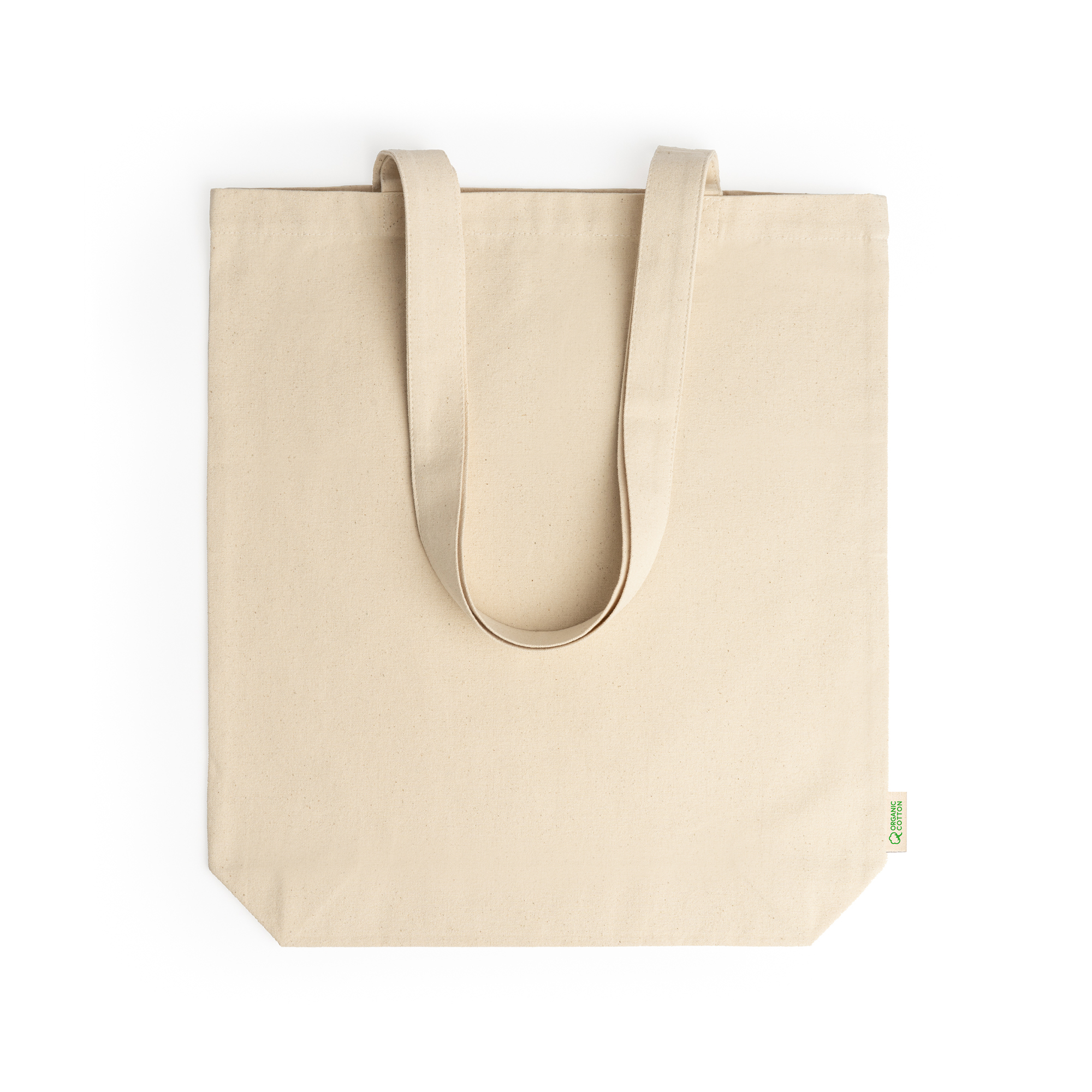 Geantă din bumbac organic 100% de 280 g/m² cu îmbinare și mânere practice lungi de 70 cm.