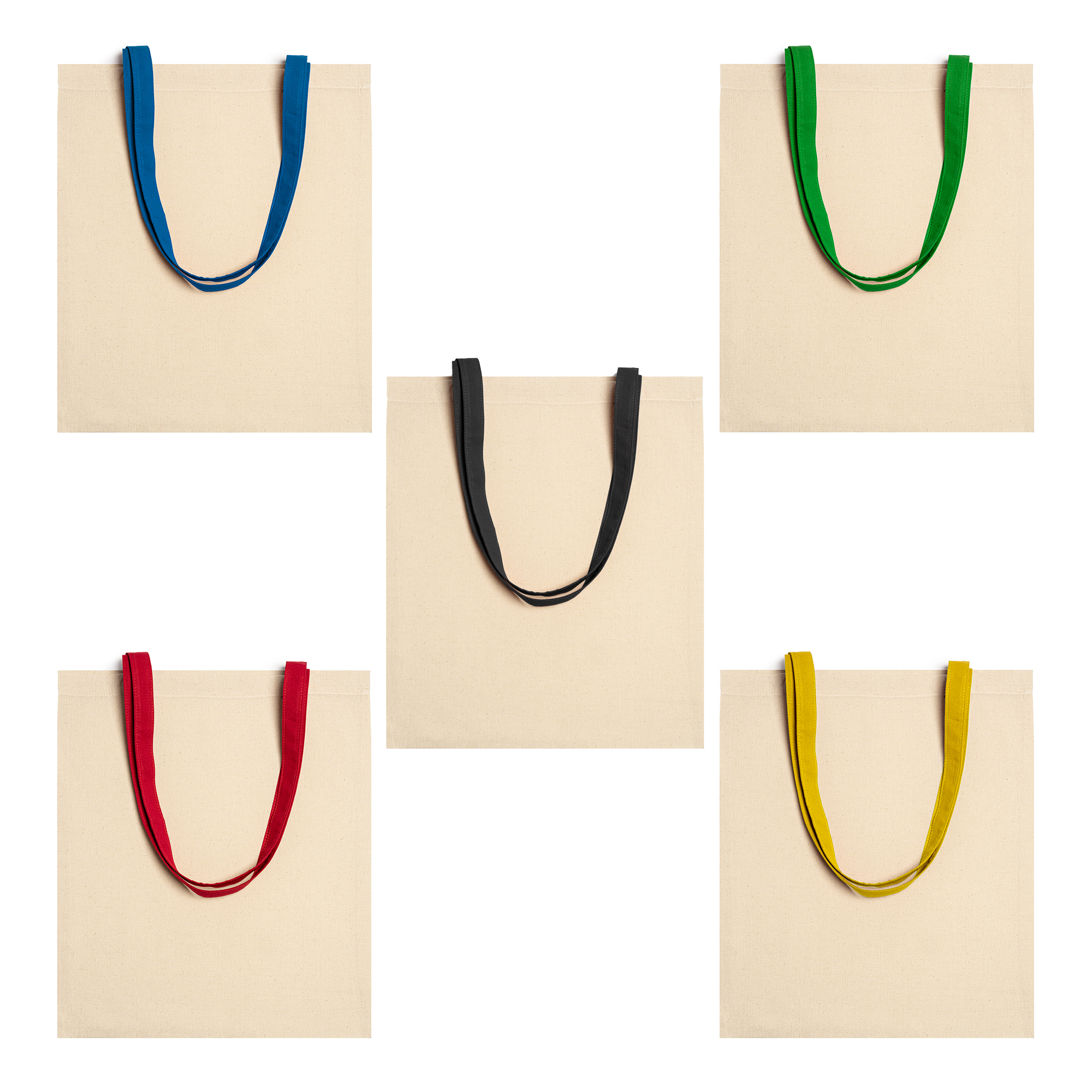 Sacoșă 100% bumbac 105 g/m². Mânere colorate largi de 70 cm.