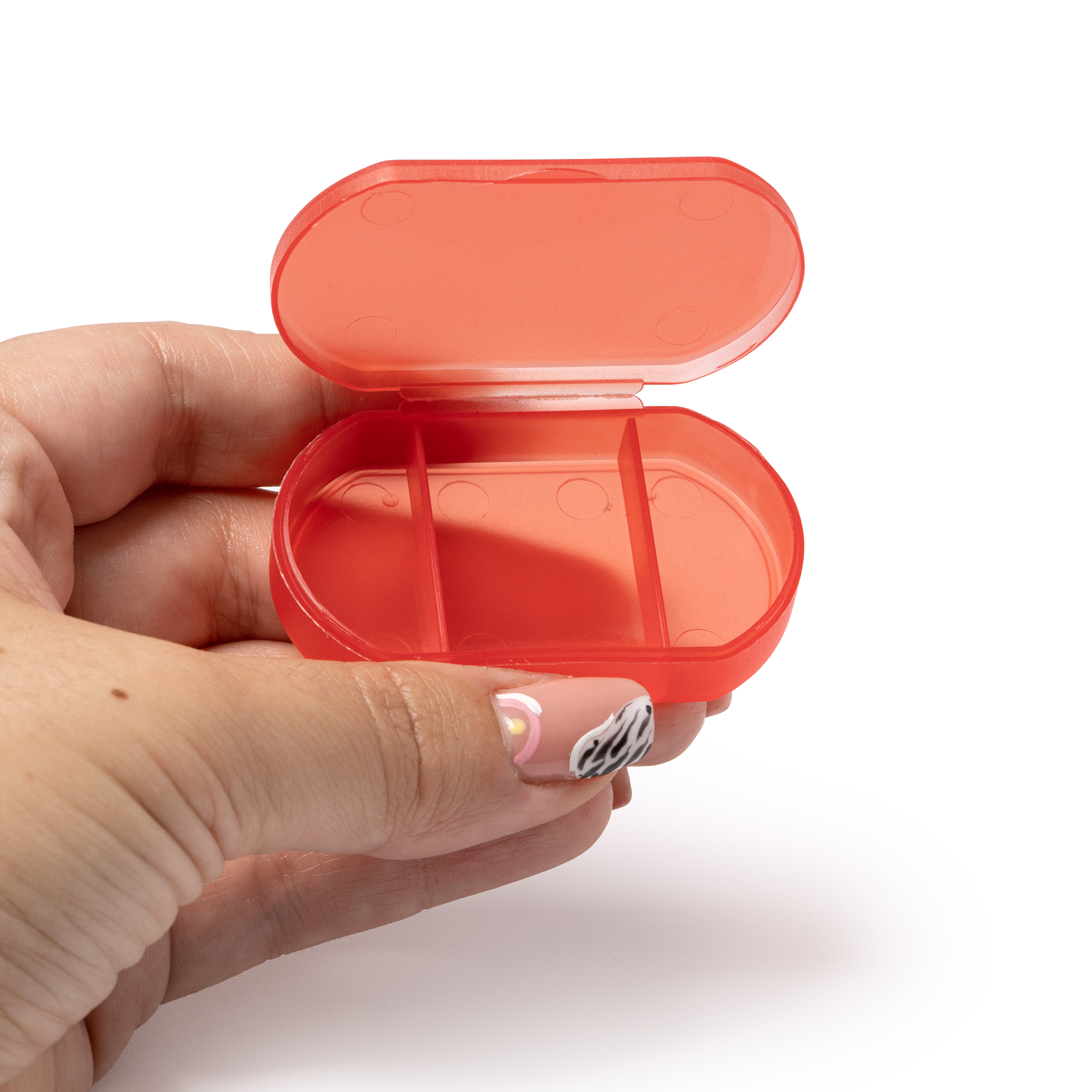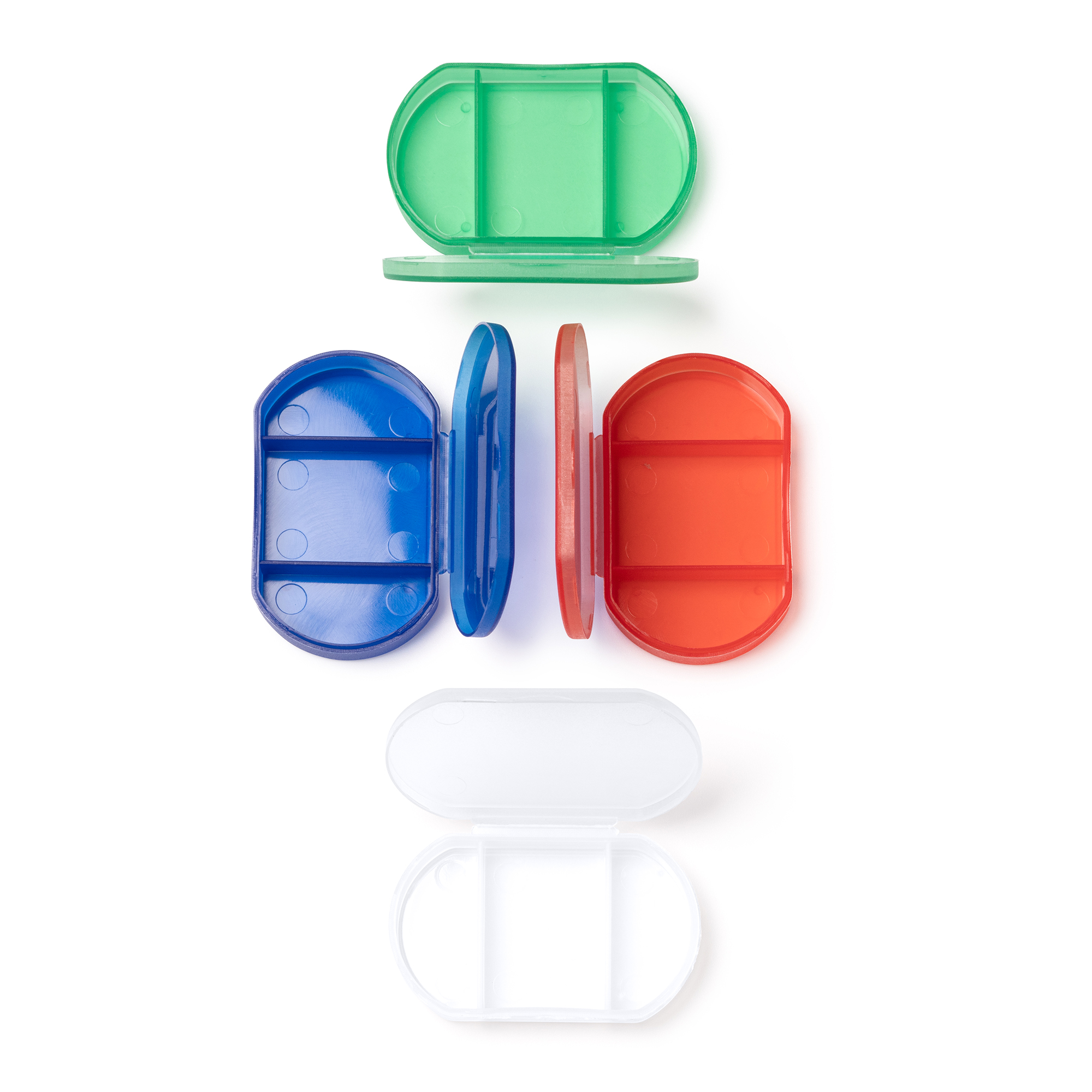 Cutie de pastile usoară cu trei compartimente. Culori translucide.