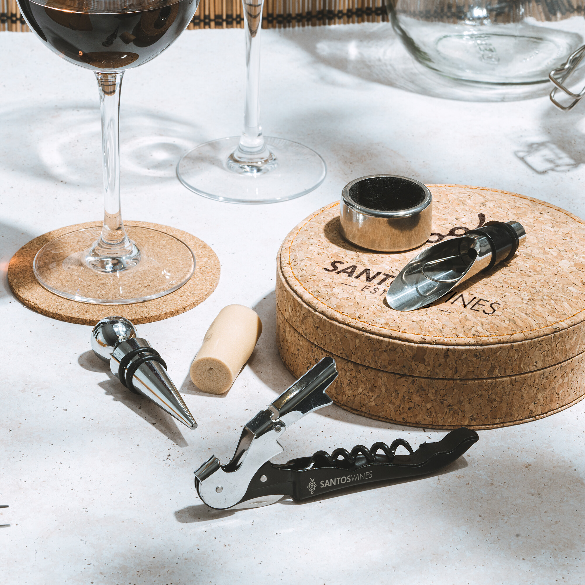 Set pentru vinuri cu accesorii din oțel inoxidabil, tirbușon 2 timpi cu cutter pentru capsule, colector de picături și dozator. Cutie din plută naturală cu interior căptușit.