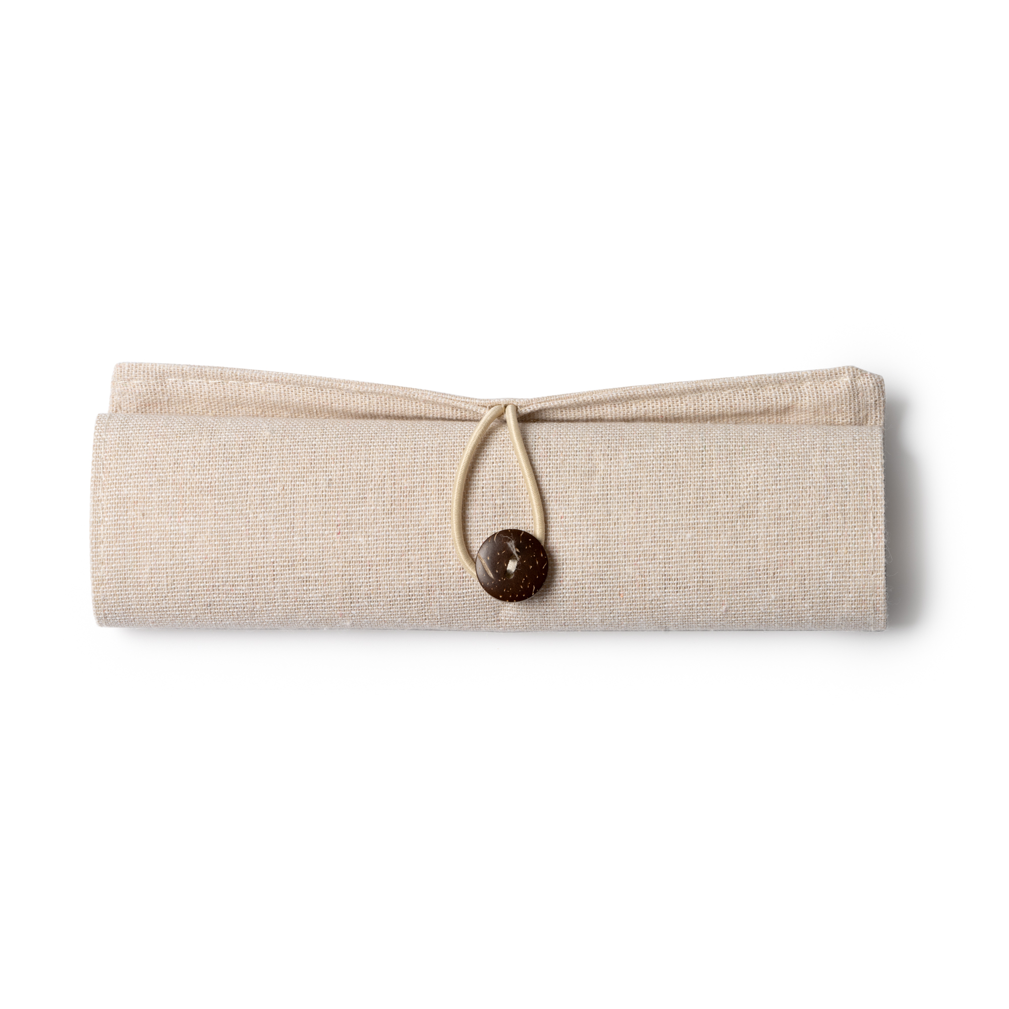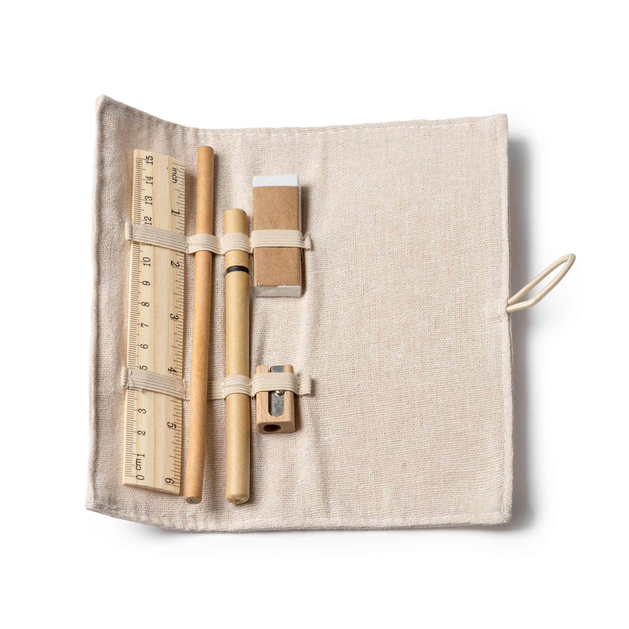 Set de scris cu riglă din bambus, creion din hârtie, stilou din carton, ascuțitoare din lemn și o radieră. Prezentare în carcasă din iută și bumbac.