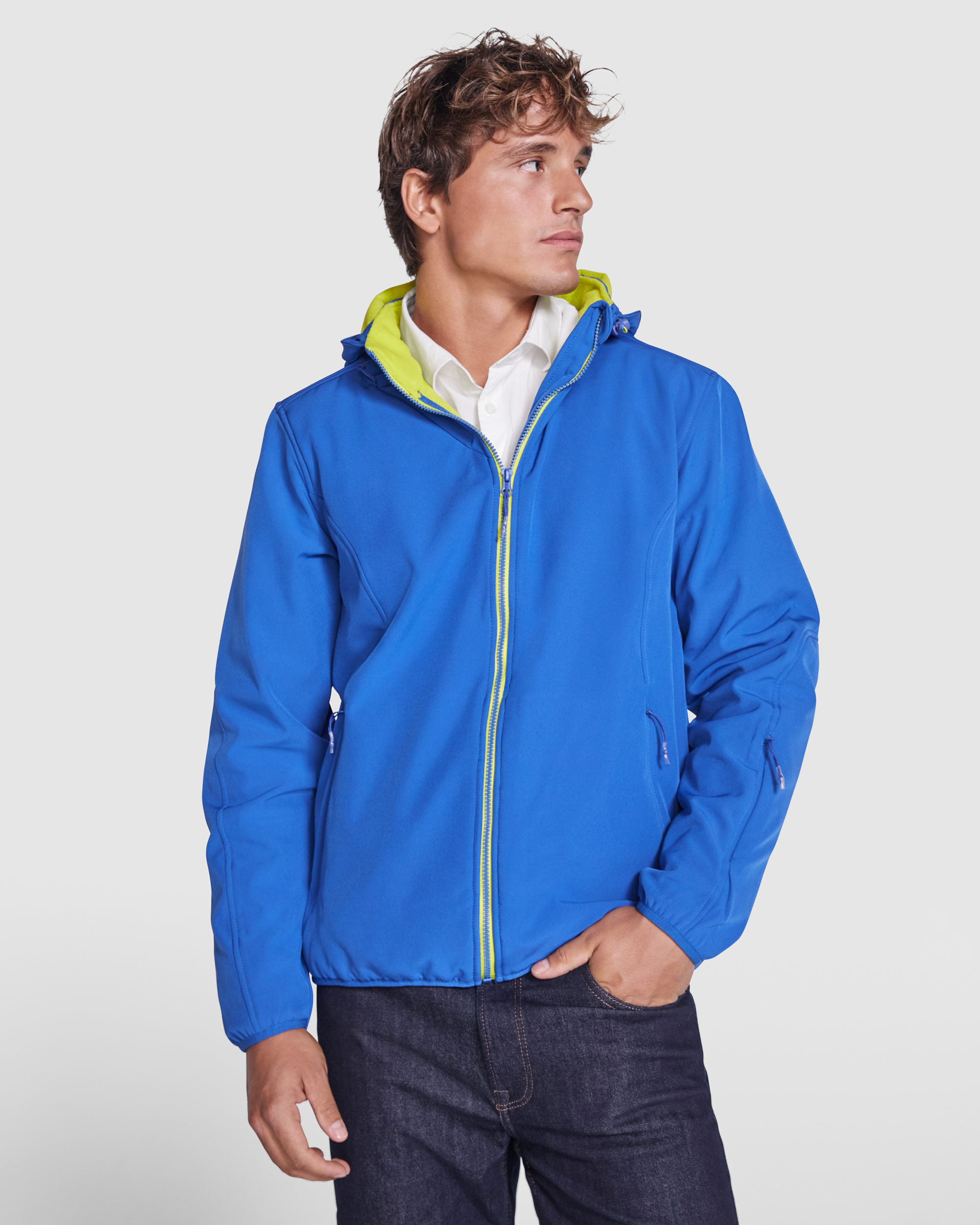 Jachetă softshell unisex cu 2 straturi și fermoar frontal contrastant. Căptușită cu material microfleece contrastant. Două buzunare laterale cu fermoar și sistem de tragere invizibil. Buzunar mic pe mâneca stângă cu fermoar și sistem de tragere invizibil. Apărătoare bărbie asortată. Elastic asortat la manșete. Ajustoare laterale interne. Glugă detașabilă cu căptușeală microfleece contrastantă.