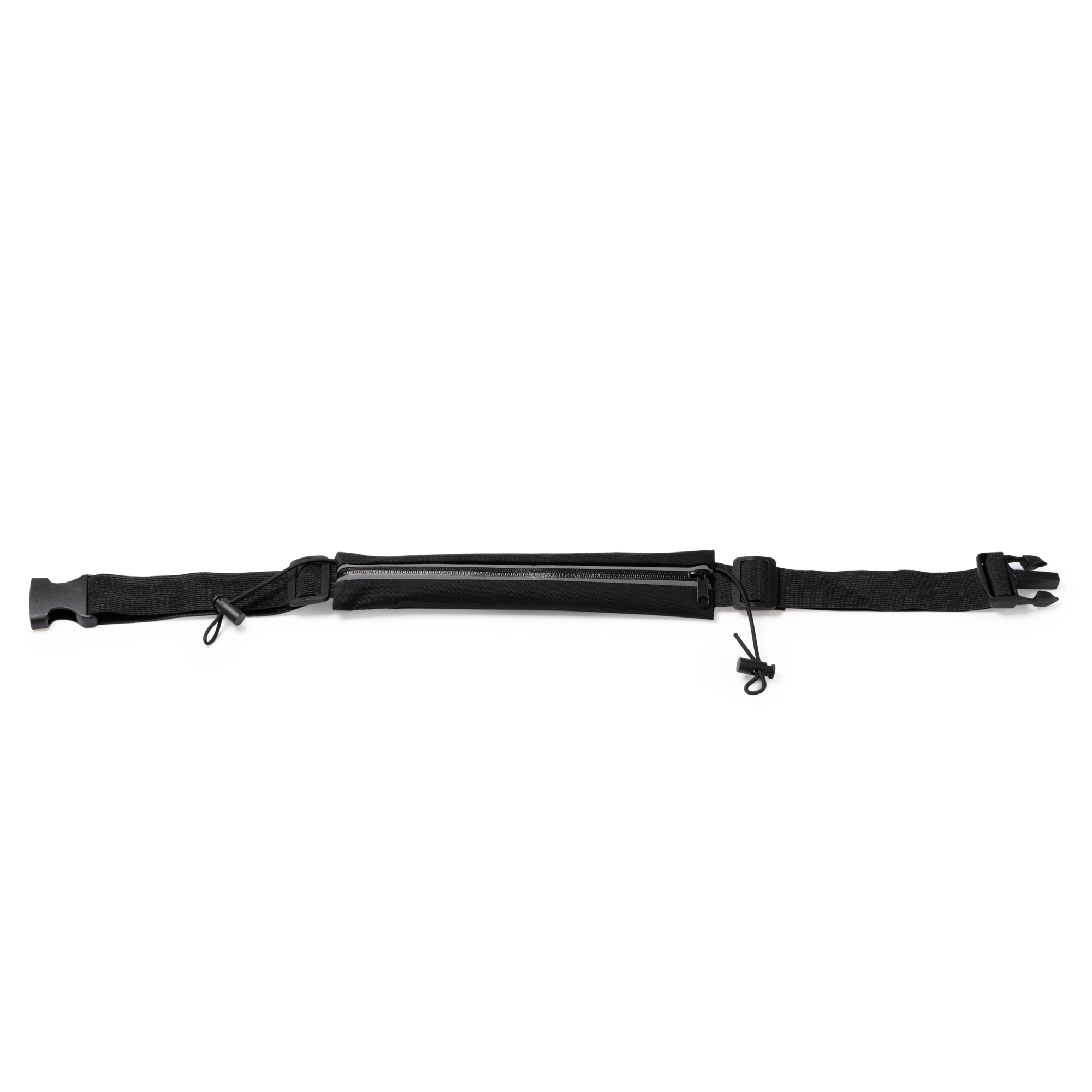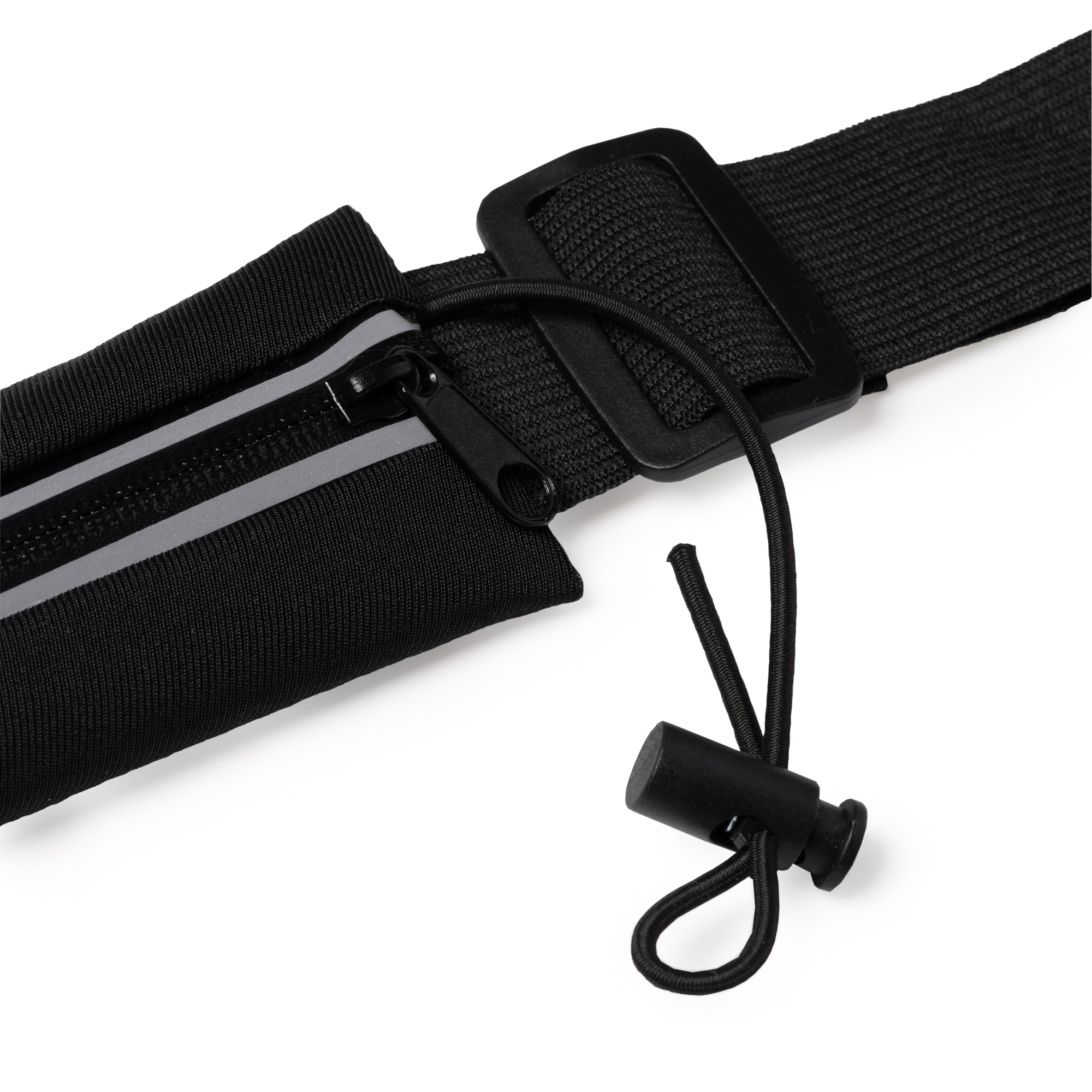 Geantă de mână din poliester spandex. Buzunar cu bandă reflectorizantă și închidere cu fermoar impermeabil. Include elastic în partea dorsală.