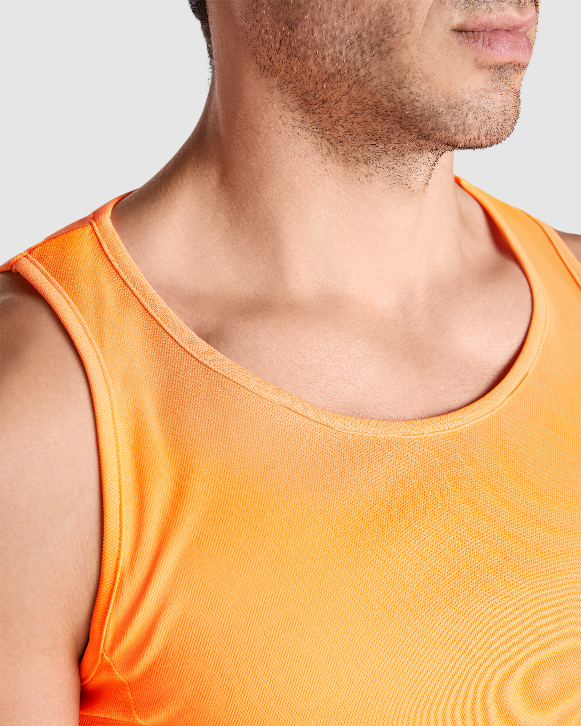 Maiou tehnic respirabil. Decolteu și guler finisate din același material. Cusături de suprapunere ton-pe-ton. Panou posterior curbat care se extinde până la tivul frontal. Certificat UV.