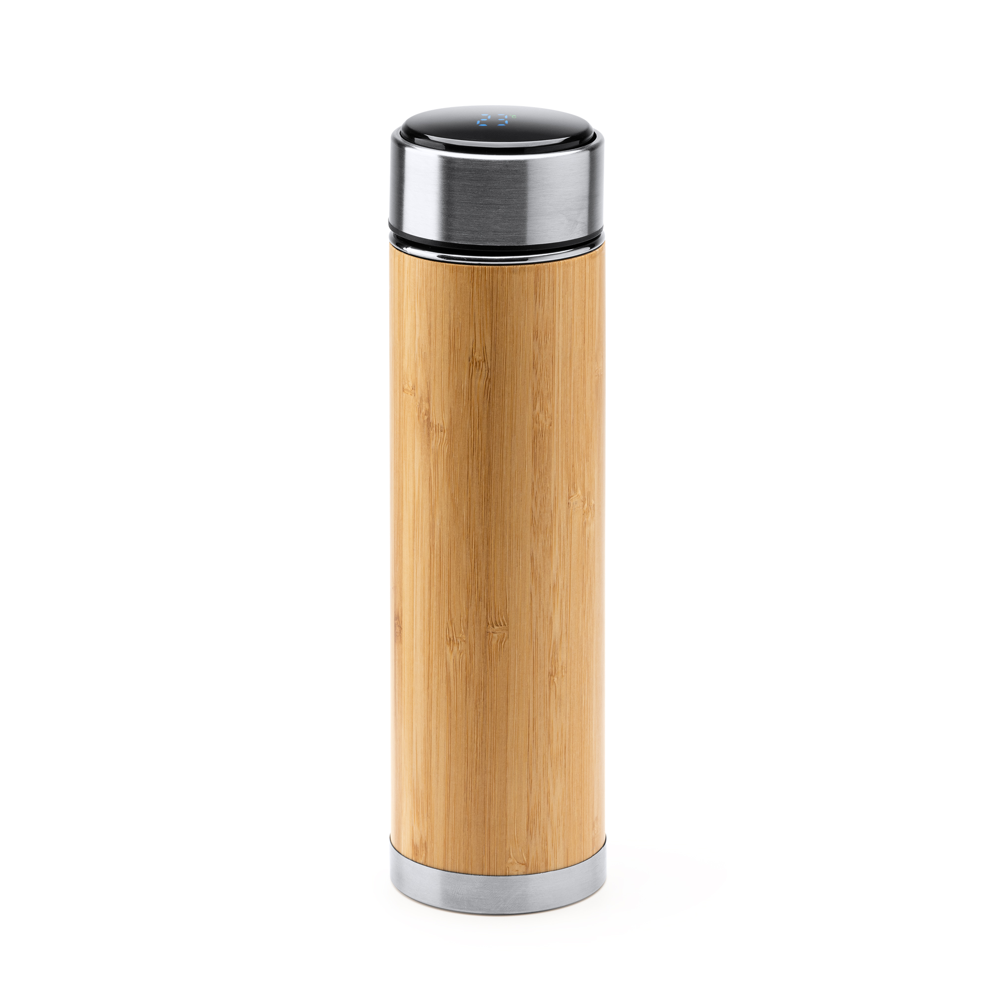 Termos cu pereți dubli din oțel inoxidabil 304 și bambus natural cu infuzor. Include termometru tactil digital pe capac pentru a ști în permanență temperatura băuturii dumneavoastră, dacă este caldă sau rece. Capacitate de 480 ml.