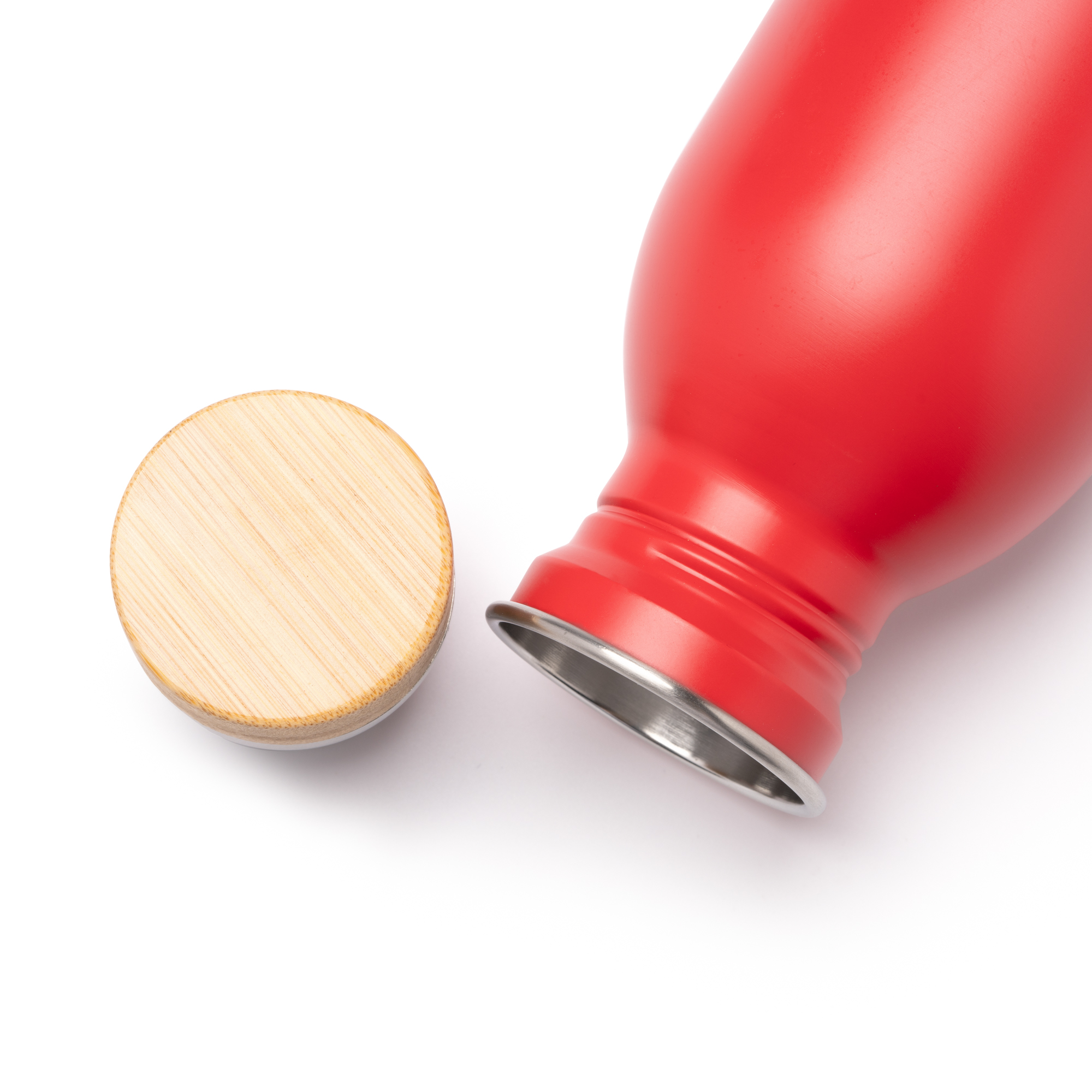 Sticlă din oțel inoxidabil 304 reciclat, cu finisaj mat și capac din bambus. Capacitate de 650 ml. Mod de prezentare: în cutie cu model eco.