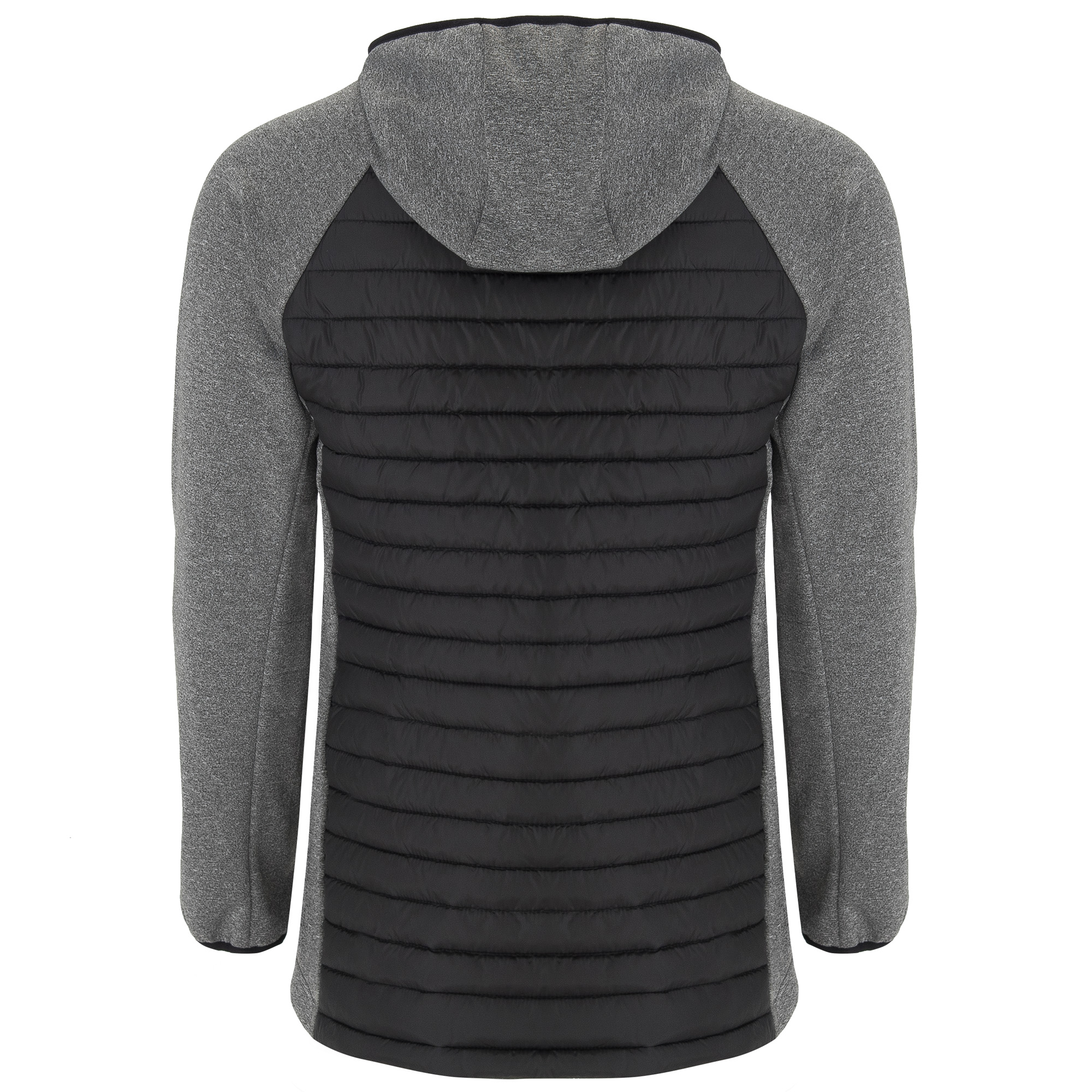 Jachetă cu mâneci raglan și glugă, realizată din două tipuri de material: partea frontală și spatele din tafta ușor căptușită, iar mânecile, gluga și panourile laterale din poliester cu căptușeală din microfleece. Buzunare laterale cu fermoar asortat introduse în panourile laterale. Ornamente elastice pe glugă și pe manșete. Spate cu tiv extins.