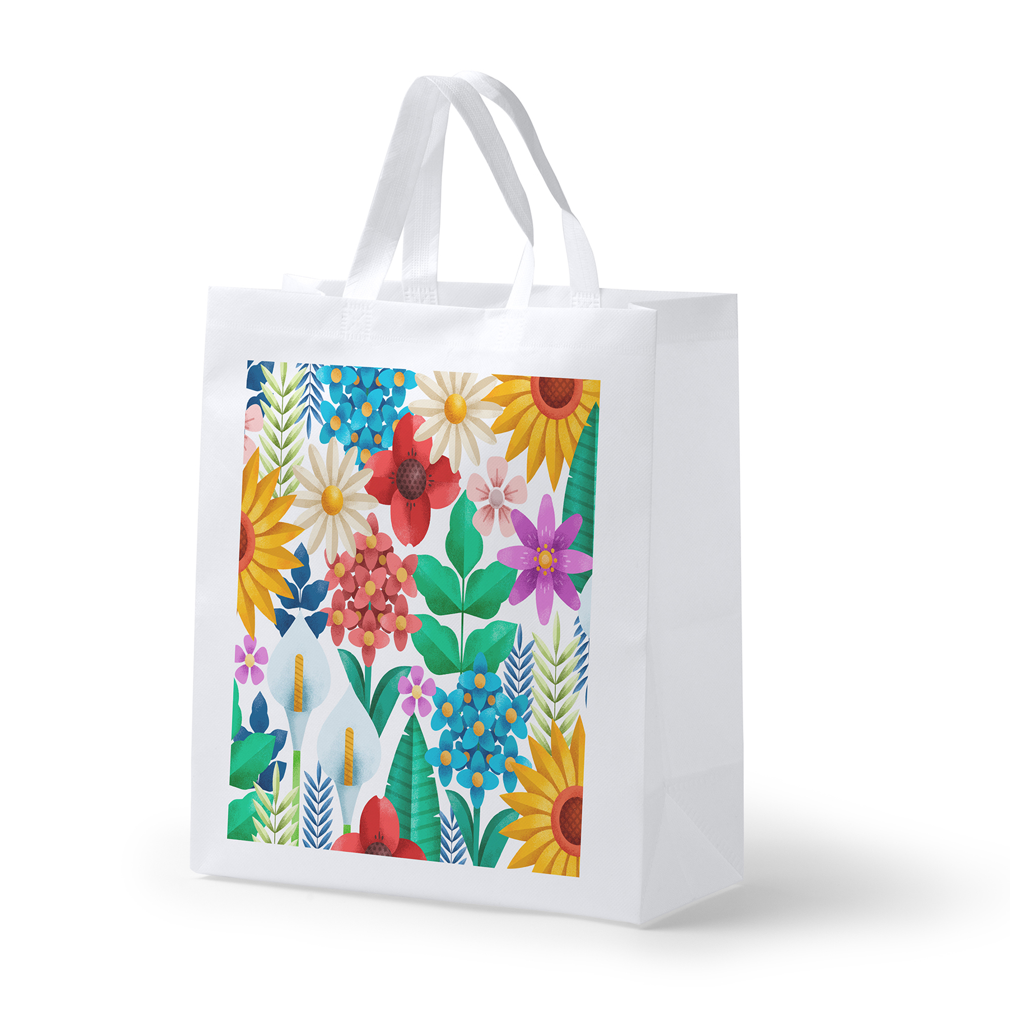 Geantă din material nețesut de 70 g/mp, specială pentru sublimare, cu bază și mânere scurte ranforsate.