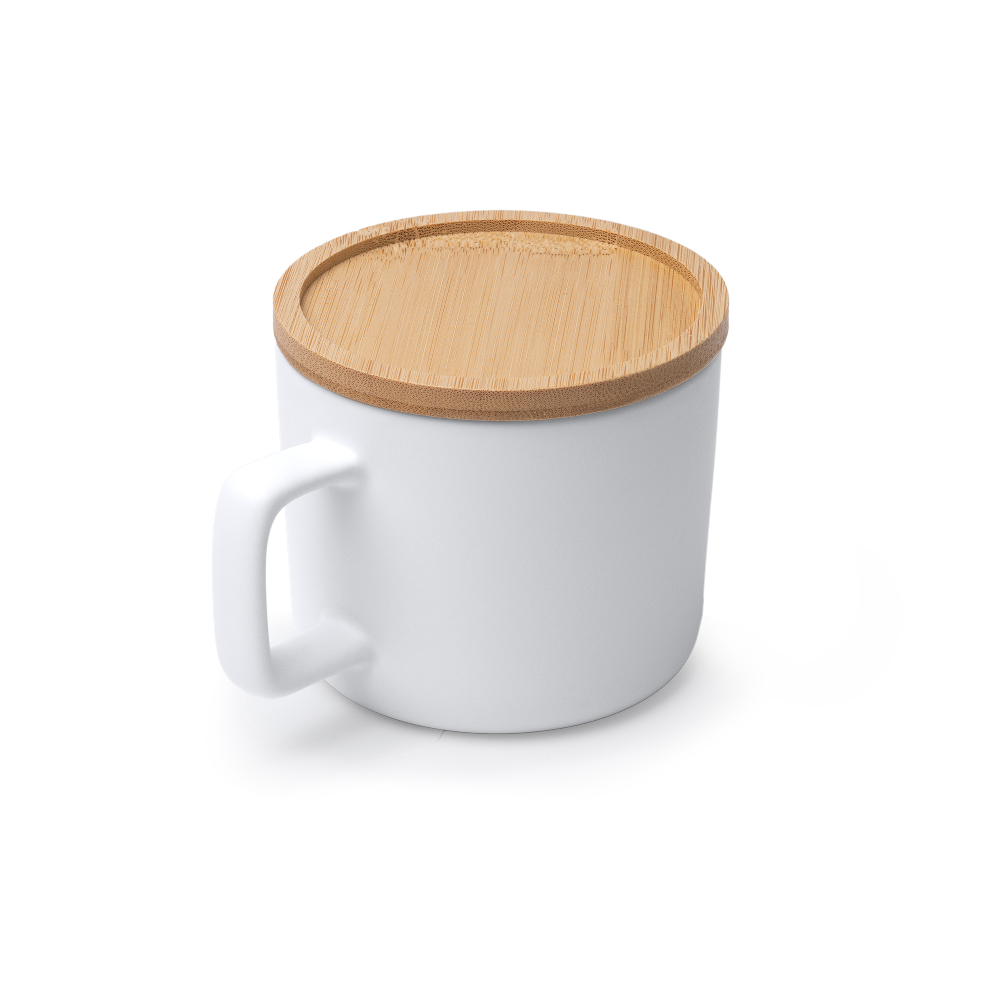 Cană ceramică exterioară cu finisaj mat, cu mâner pătrat. Are o capacitate de 350 ml și un capac din bambus care funcționează și ca suport pentru pahare, adăugând o versatilitate suplimentară. Interiorul său are un finisaj lucios pentru o rezistență și durabilitate sporite. Design special pentru sublimare.