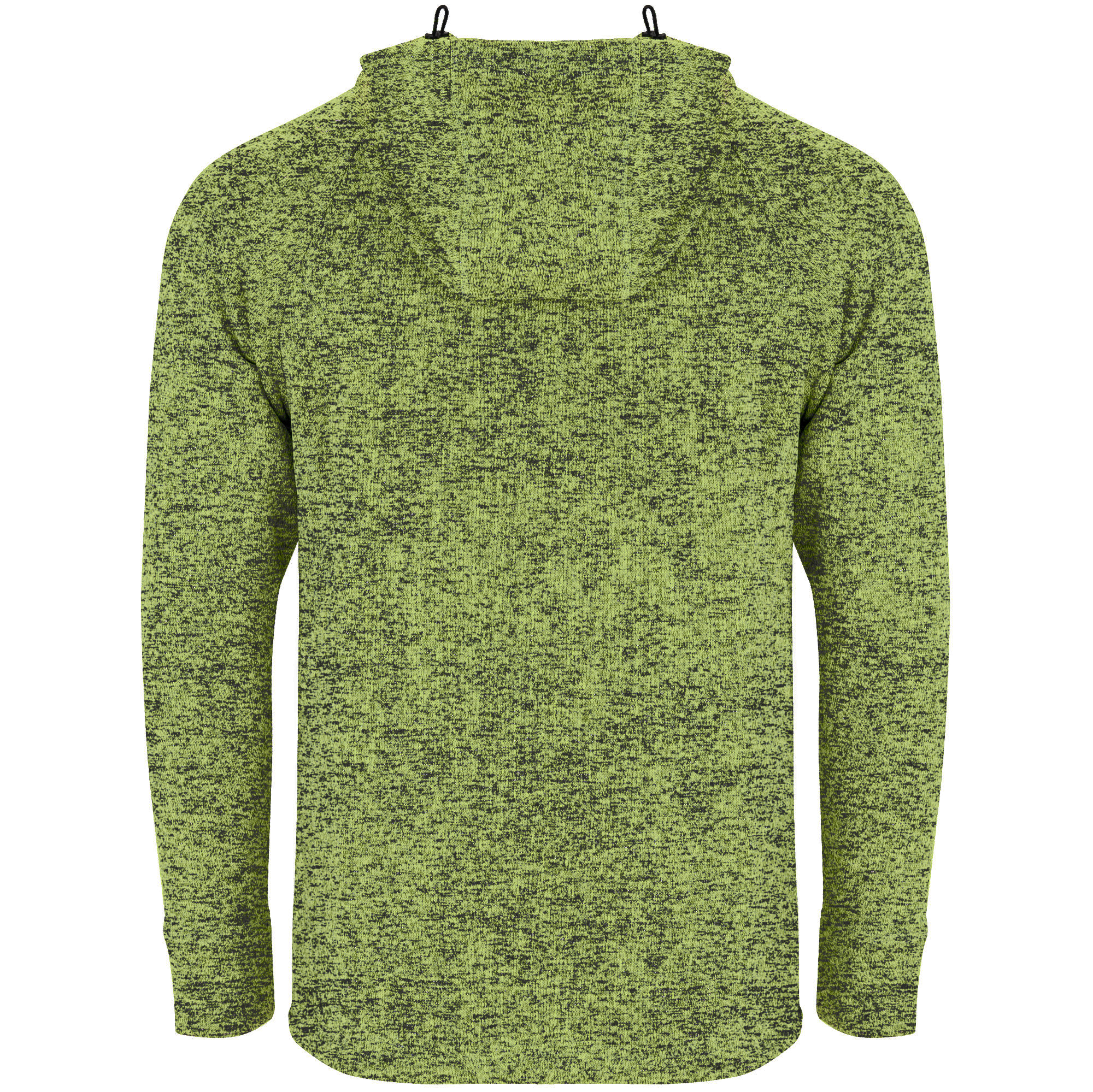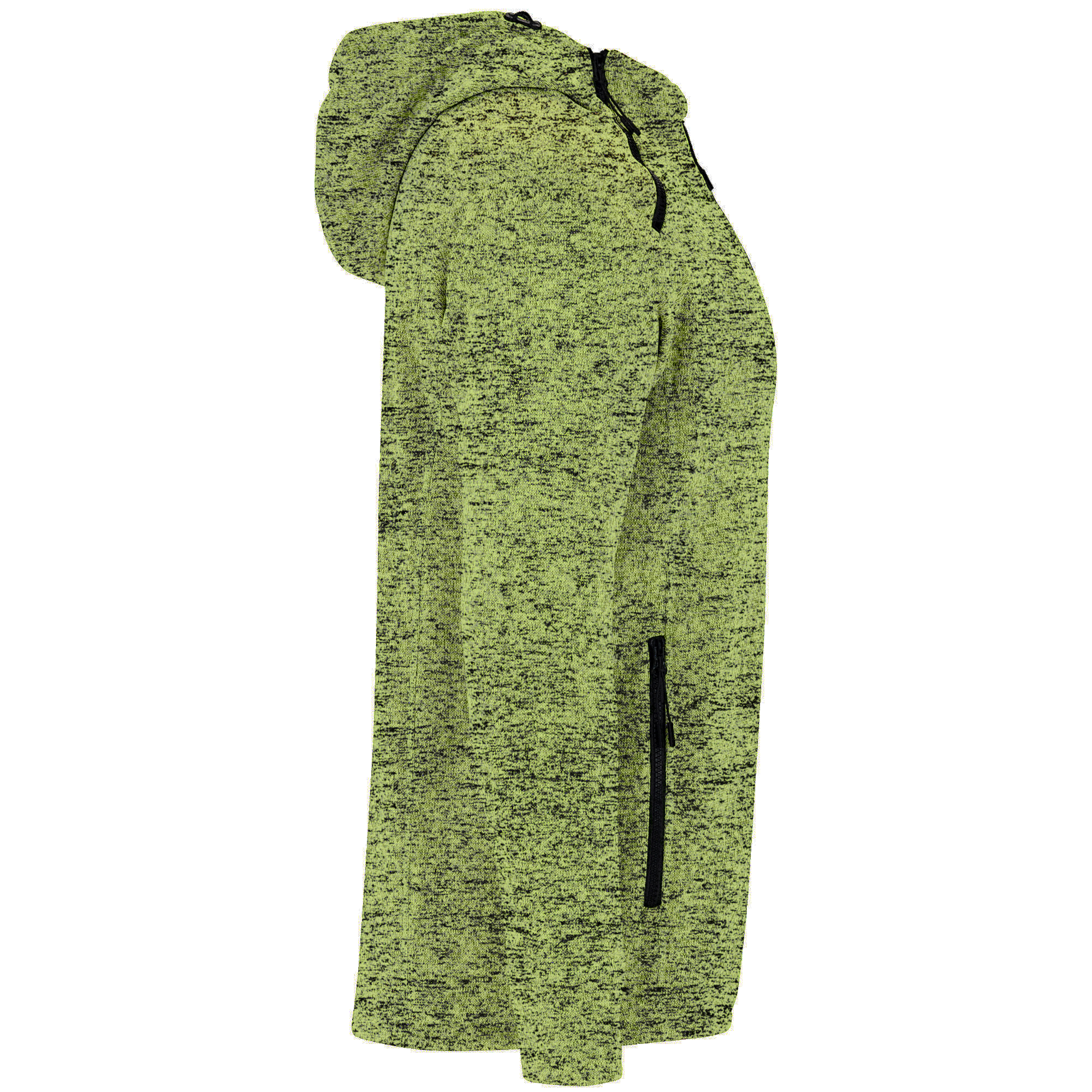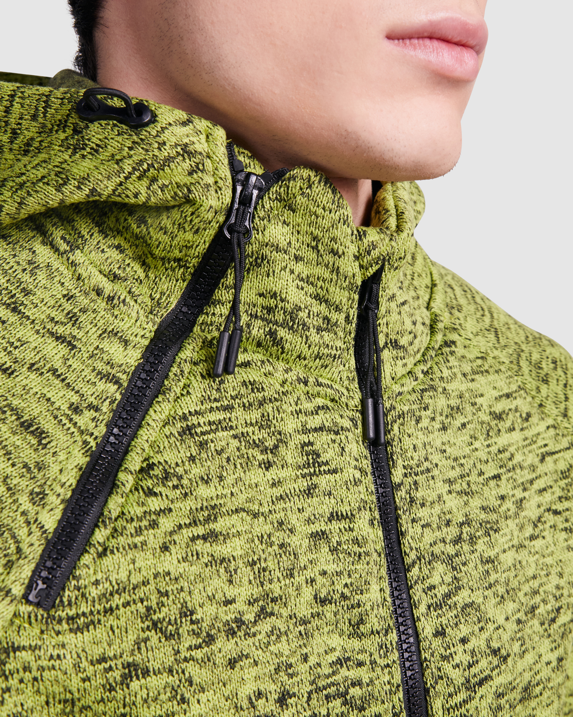 Hanorac din tricot cu glugă. Fermoar inversat cu cheițe de design. Fermoarul pe mijloc cu protecție pentru bărbie și un al doilea fermoar decorativ la gât pentru o deschidere mai ușoară. Guler înalt cu șnur reglabil de design și bandă întărită pentru acoperirea cusăturii la interior. Două buzunare frontale cu fermoar. Partea din spate mai lungă decât cea din față, cu șnur reglabil de design.