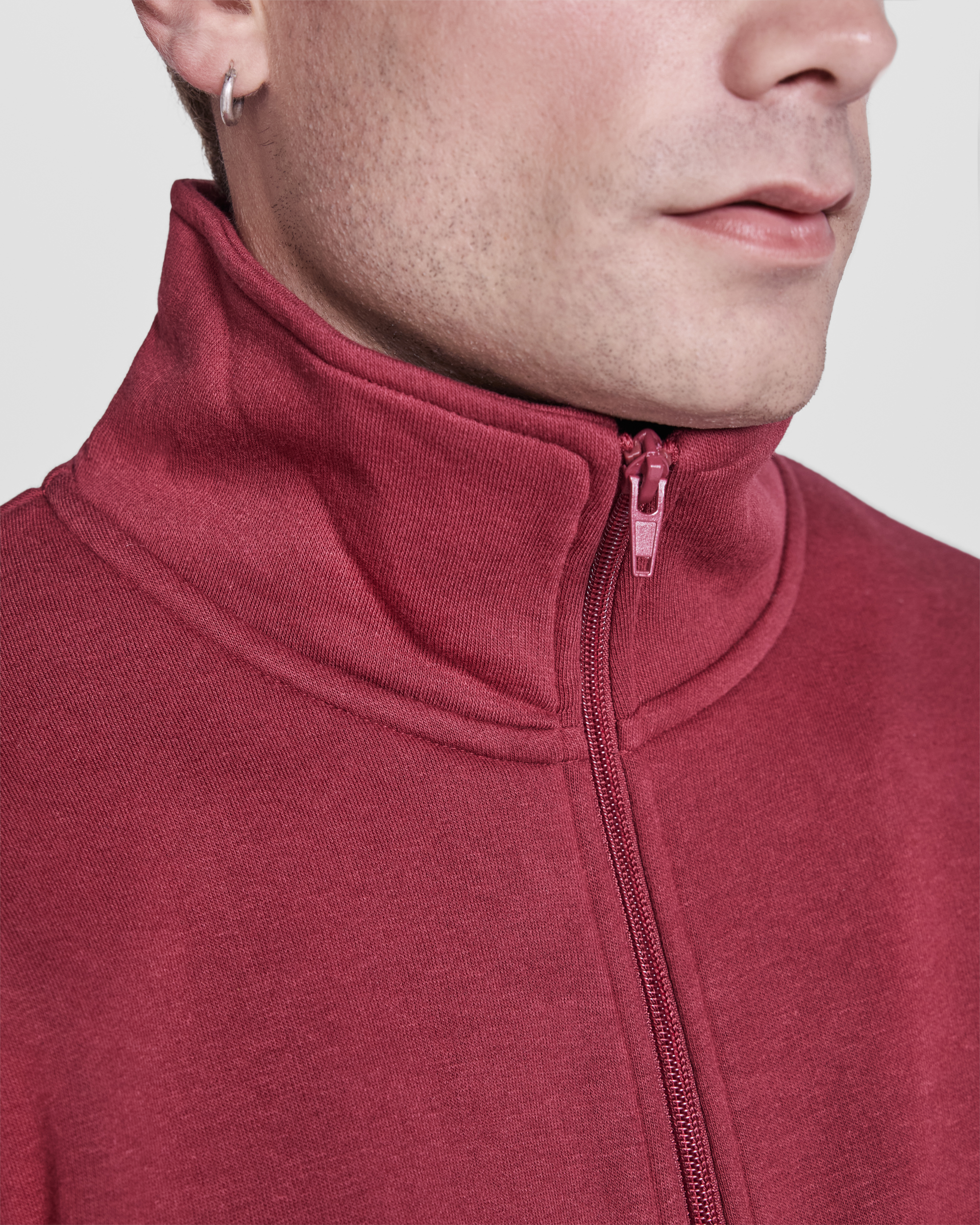 Hanorac unisex cu fermoar în față și guler înalt. Fermoar asortat. Două buzunare laterale cu căptușeală din material asortat. Manșete și betelie cu nervuri 2×1 cu elastan. Cu bandă asortată întărită pentru acoperirea cusăturii.