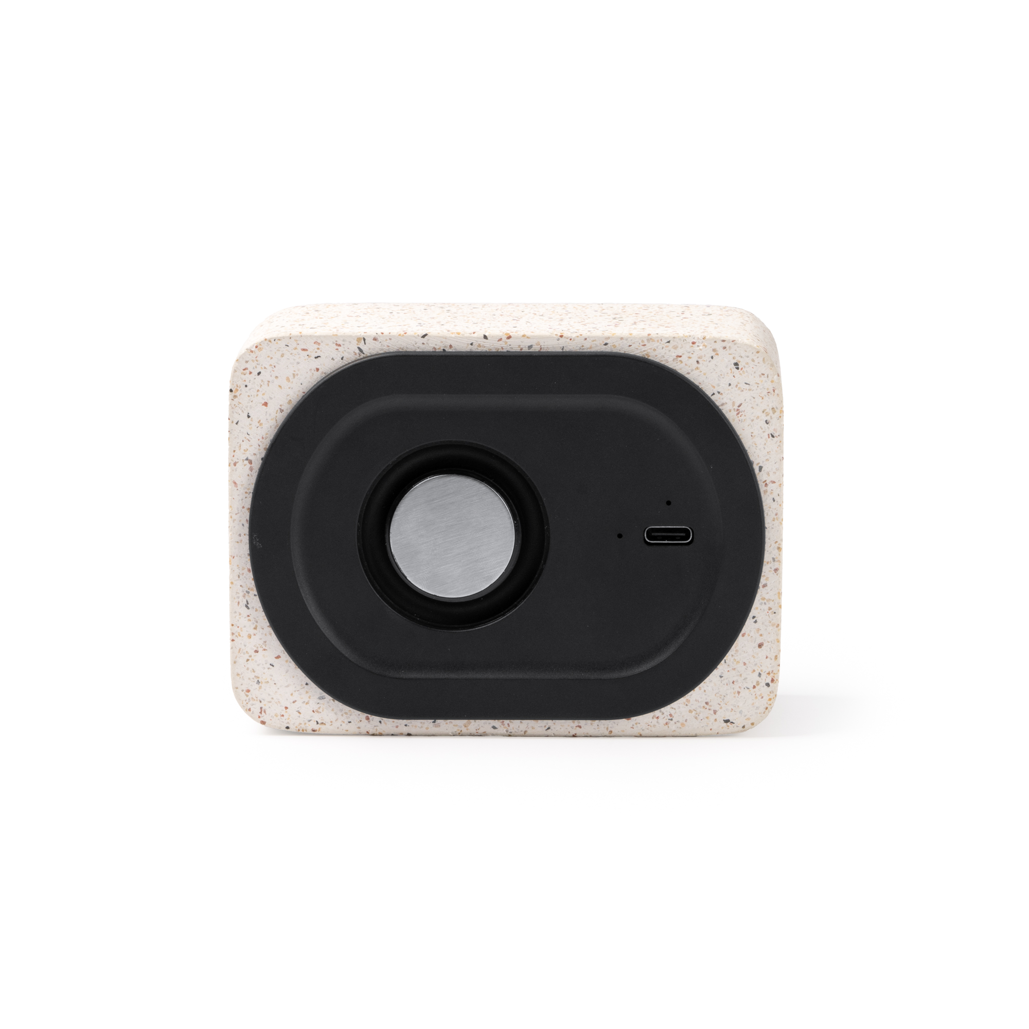Difuzor wireless cu corp din piatră terrazzo reciclată și bambus. Putere: 5W. Cablu de tip C inclus. Prezentare în cutie cu design ecologic.