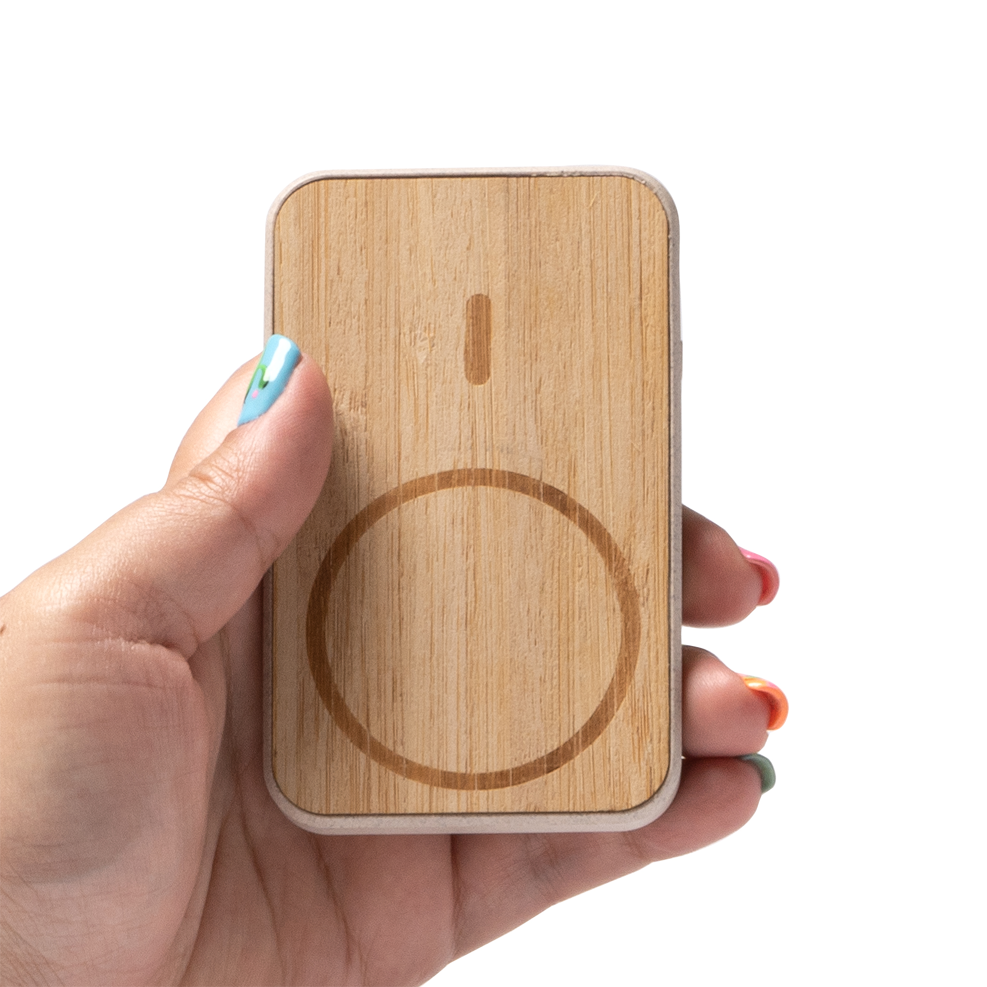 Cu bateria externă de 5.000 mAh cu corp din fibre de bambus și grâu și încărcător wireless magnetic, vă puteți menține dispozitivele încărcate într-un mod convenabil și ecologic, bucurându-vă în același timp de confortul suportului integrat.