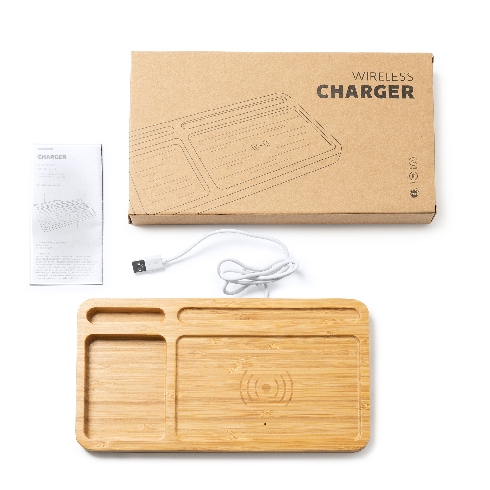 Încărcător wireless natural din bambus integrat în tava organizatoare. Compatibil cu dispozitivele cu tehnologie cu încărcare wireless. Putere de ieșire de 5 W. Cablu alb inclus.