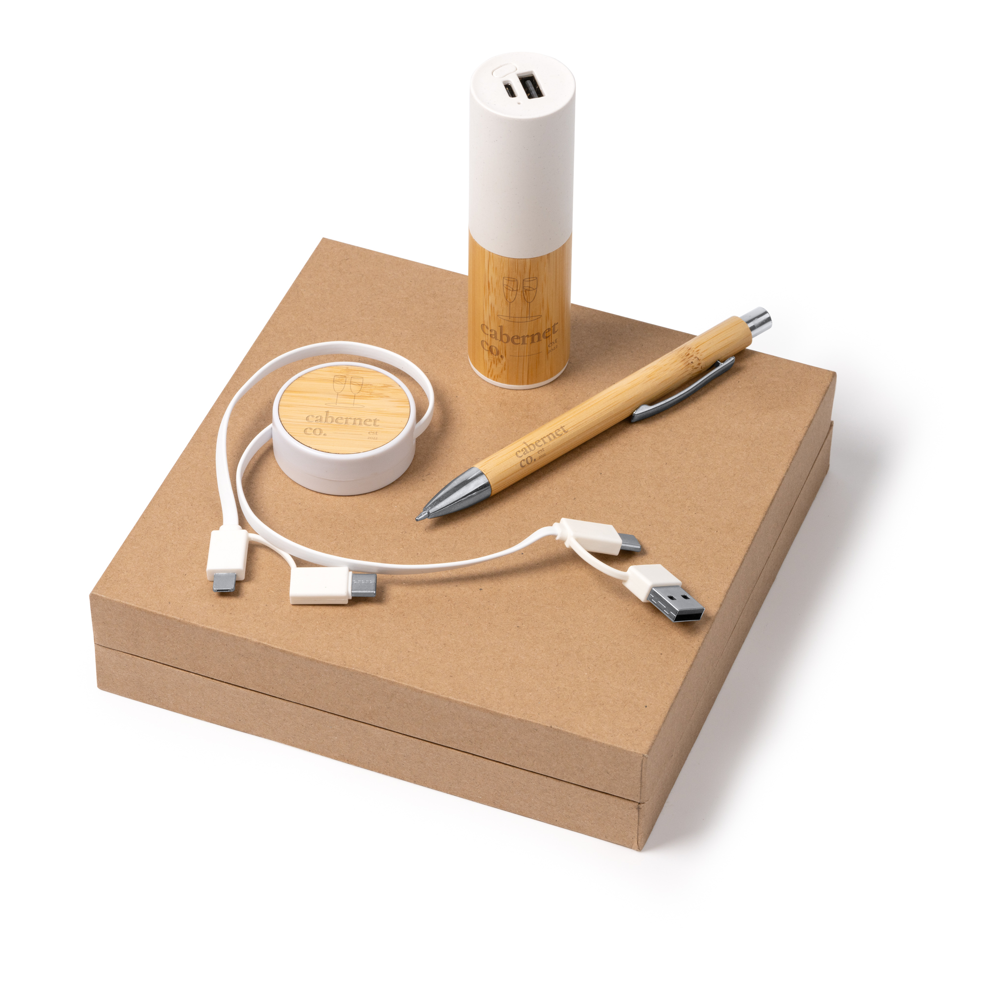 Set cadou care include o baterie externă de 5.000 mAh, fabricată din bambus și ABS reciclat, cu intrare USB și ieșire Type-C. De asemenea, include un cablu de încărcare extensibil, fabricat din bambus și ABS reciclat, cu intrare Type-C și USB și ieșire Type-C și Lightning, precum și un stilou din bambus cu cerneală albastră.