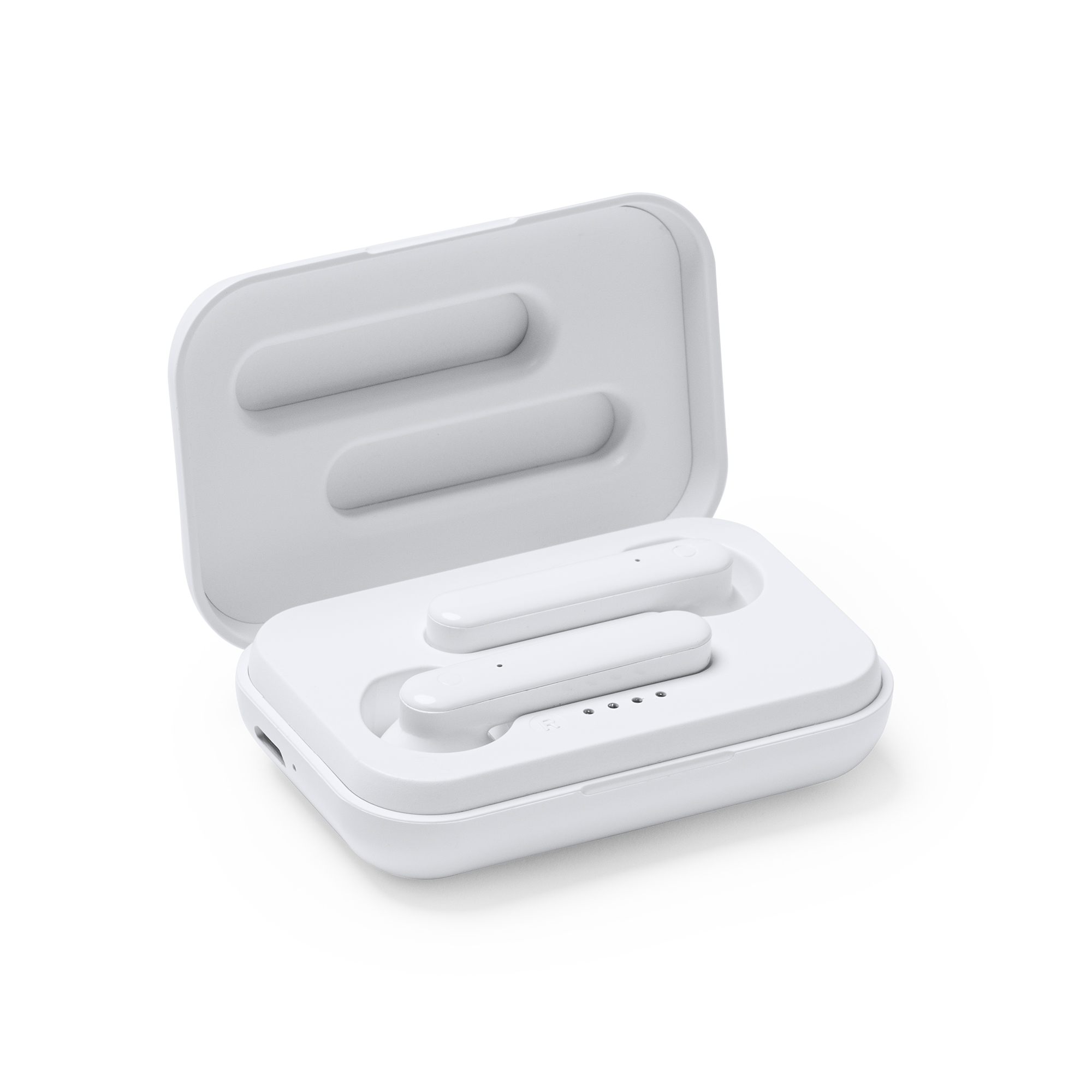 Căști wireless Bluetooth 5.0 cu carcasă de încărcare. Finisaj alb lucios și elegant. Panou de control cu tehnologie tactilă integrată în căști. Funcție handsfree. Carcasă baterie reîncărcabilă cu capac magnetic. Cablu inclus.