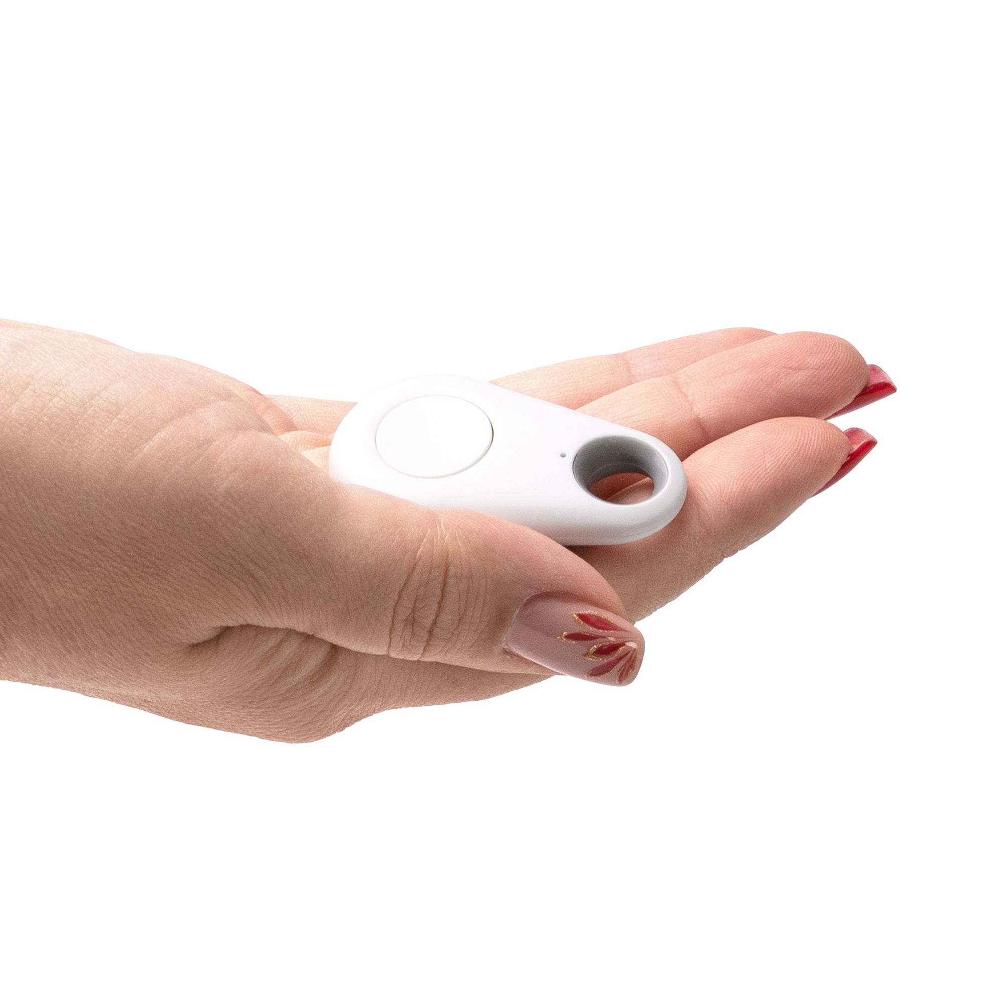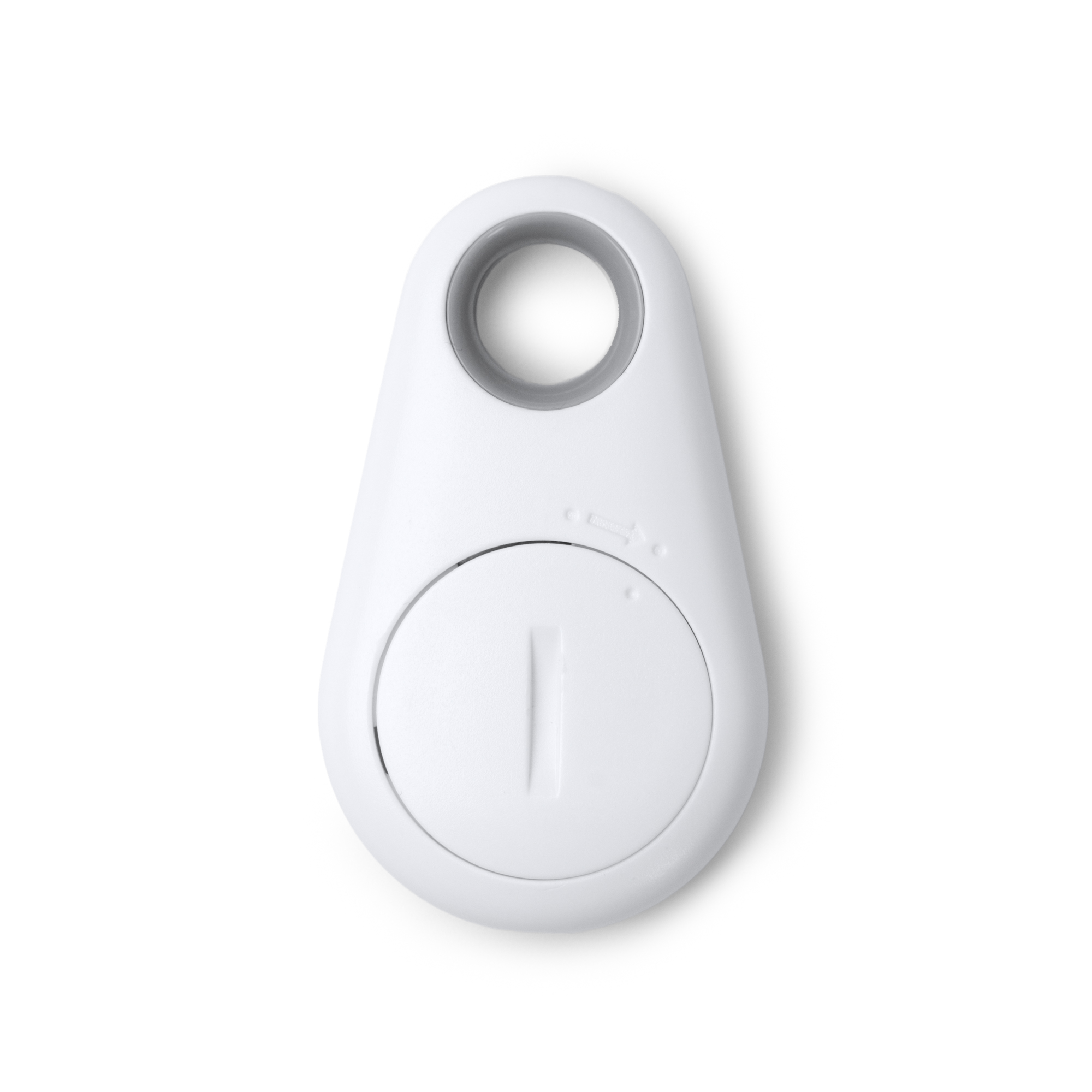 Dispozitiv de localizare anti‑pierdere. Compatibil cu dispozitivele iOS și Android prin aplicația mobilă prin conexiune Bluetooth. Dispozitivul este alimentat cu baterie și are un orificiu încorporat pentru transport și utilizare ușoară. Caracteristicile includ o funcție de declanșare de la distanță, înregistrare vocală și alarmă sonoră.