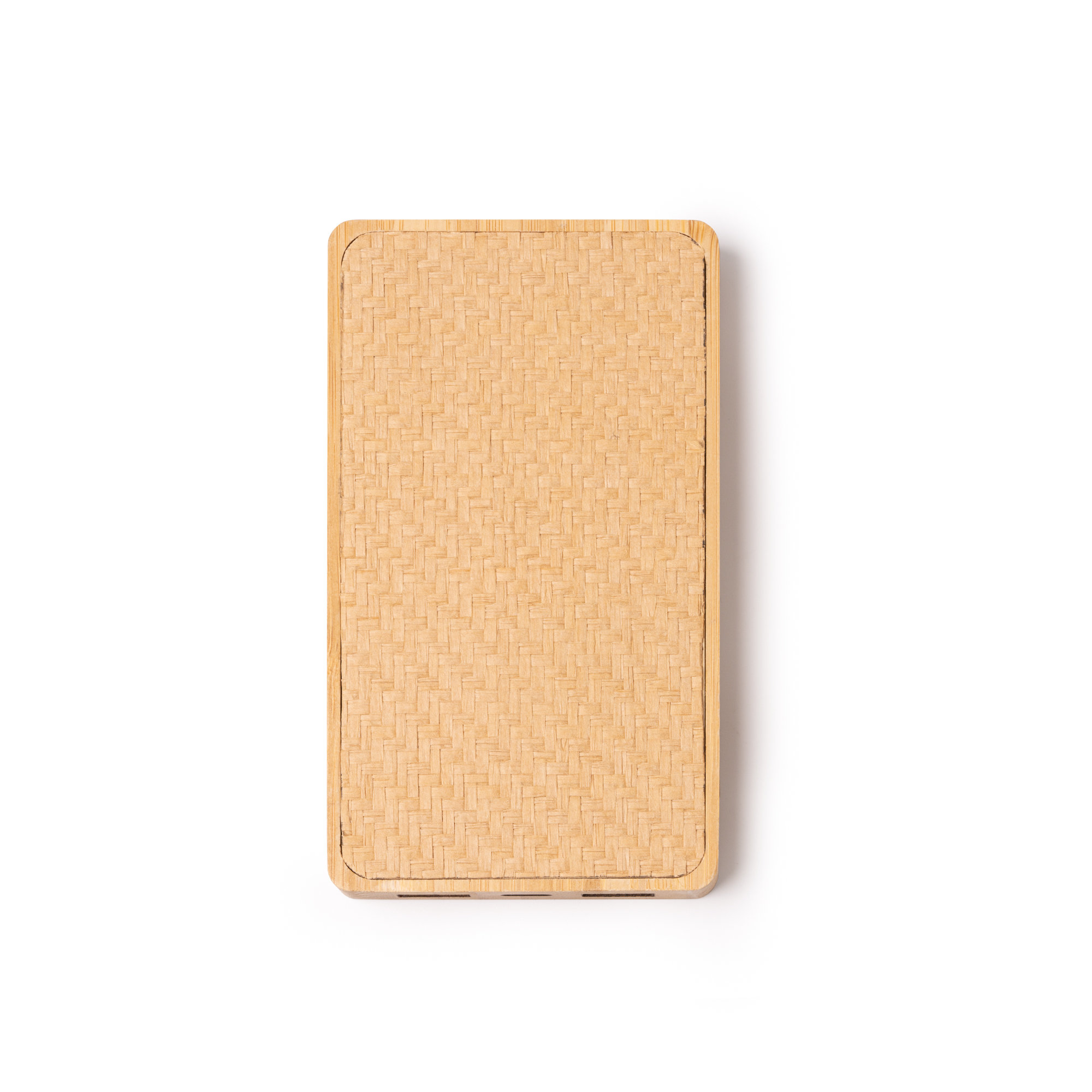 Baterie externă cu structură principală din bambus și bază din fibre naturale. Capacitate de 8.000 mAh. Intrare de tip C. Un port de tip C și două porturi de ieșire USB. Cablu inclus. Mod de prezentare: în cutie cu model eco.