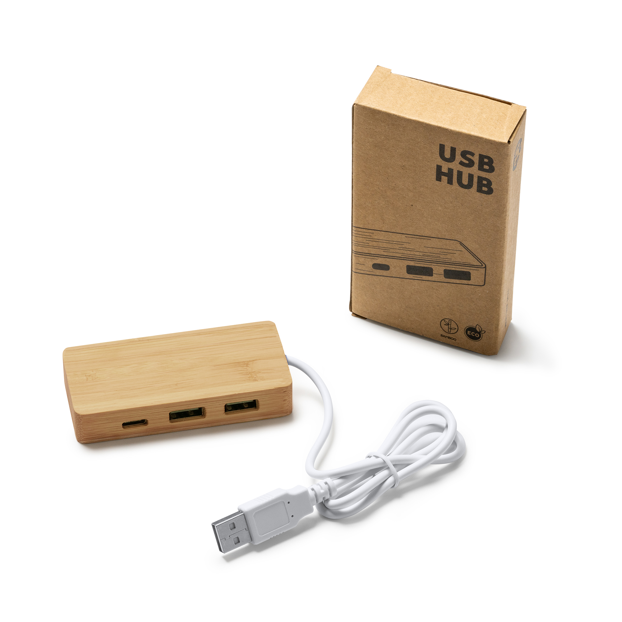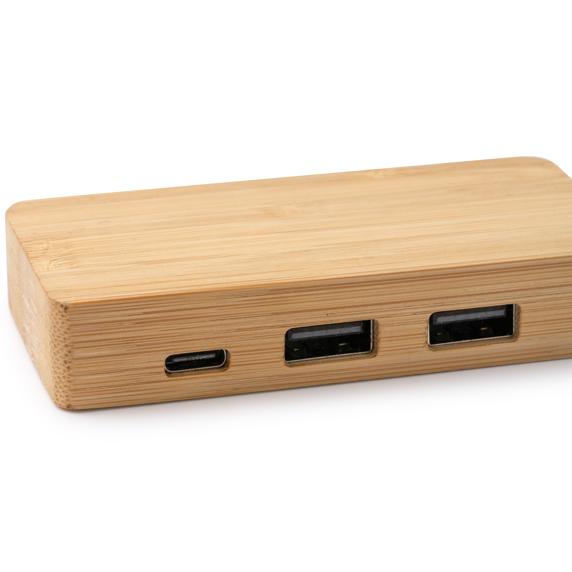 Port USB realizat cu corp din bambus natural și cablu orb. Include 2 porturi USB și 1 port Type-C.