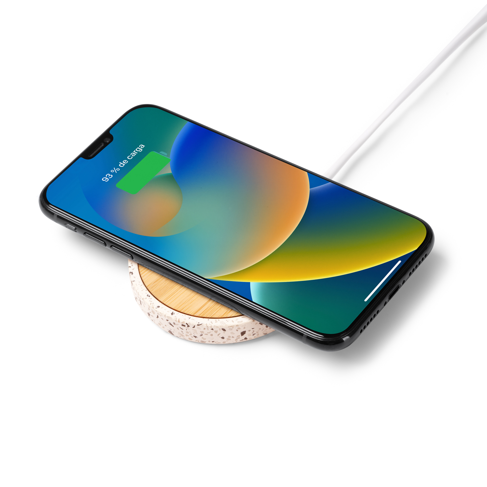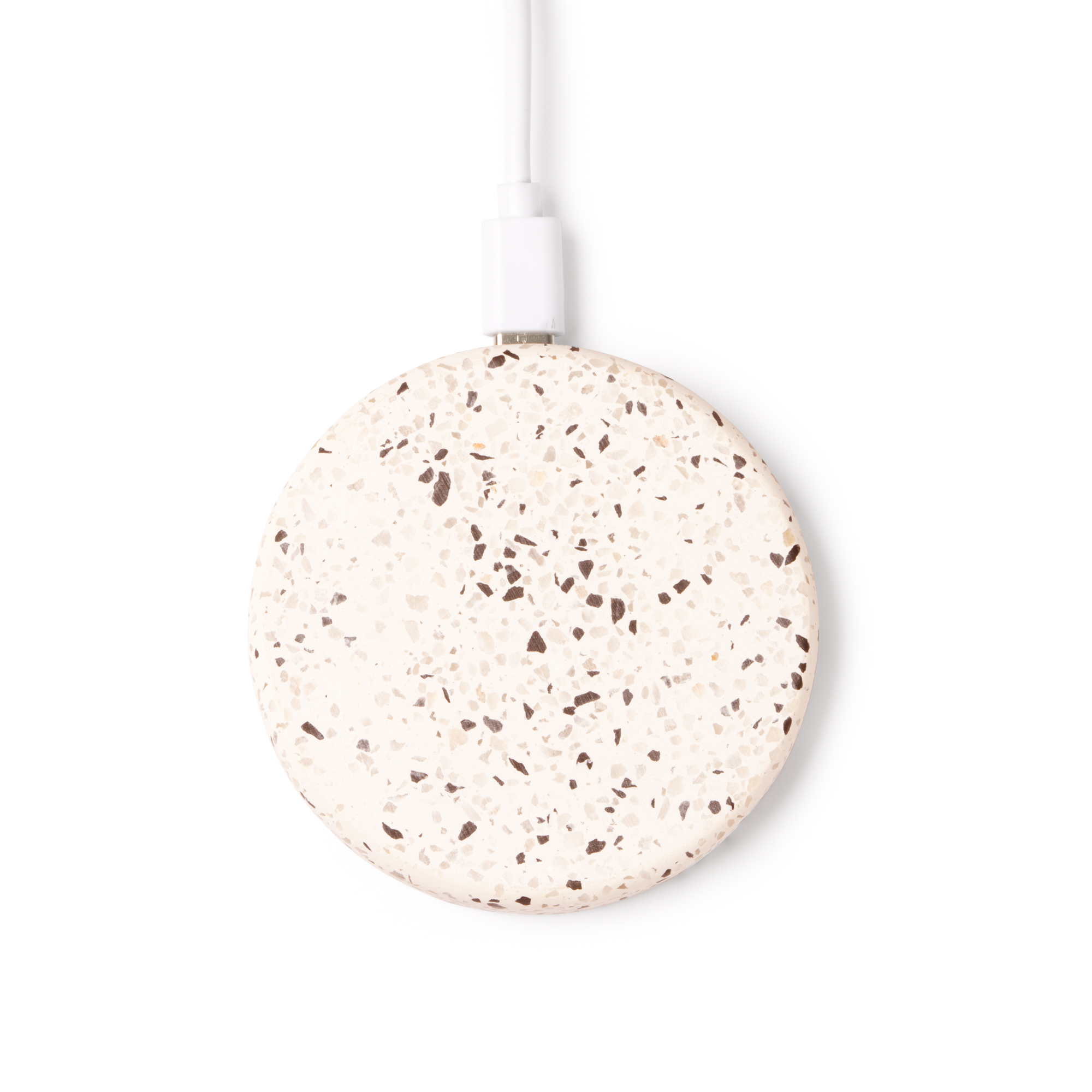Încărcător wireless cu corp din piatră terrazzo reciclată și bambus. Încărcare wireless 10W. Cablu de tip C inclus. Prezentare în cutie cu design ecologic.