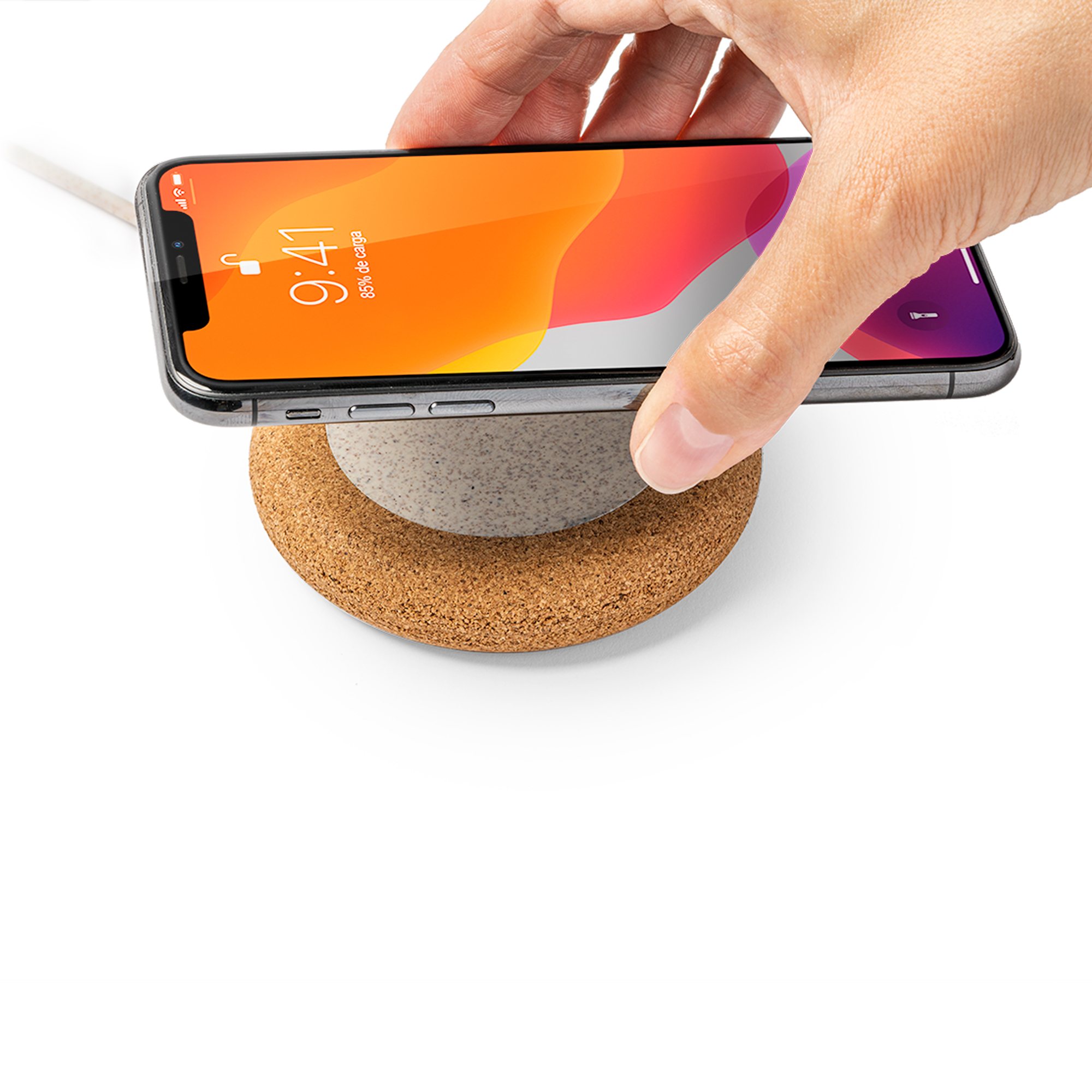 Încărcător wireless cu corp din plută naturală și fibră de grâu, cu o putere de 5W. Cablu inclus.