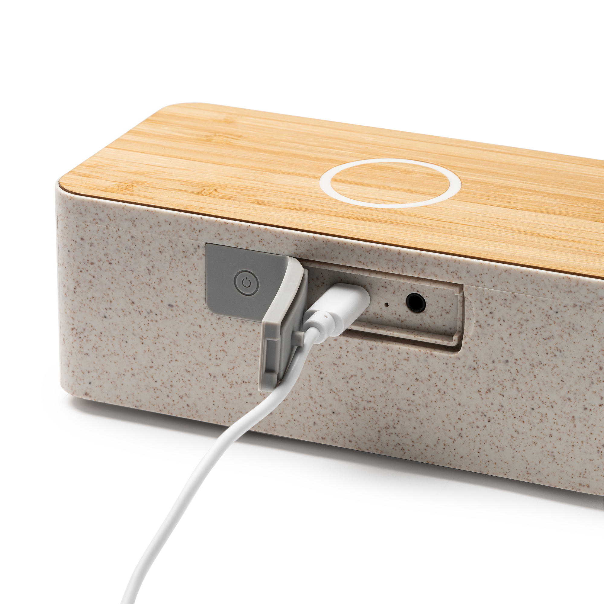 Difuzor Bluetooth cu bază de încărcare fără fir. Structură principala din fibră de grâu și suprafață naturală din bambus. Ieșire wireless de 10W. Include baterie reîncărcabilă.