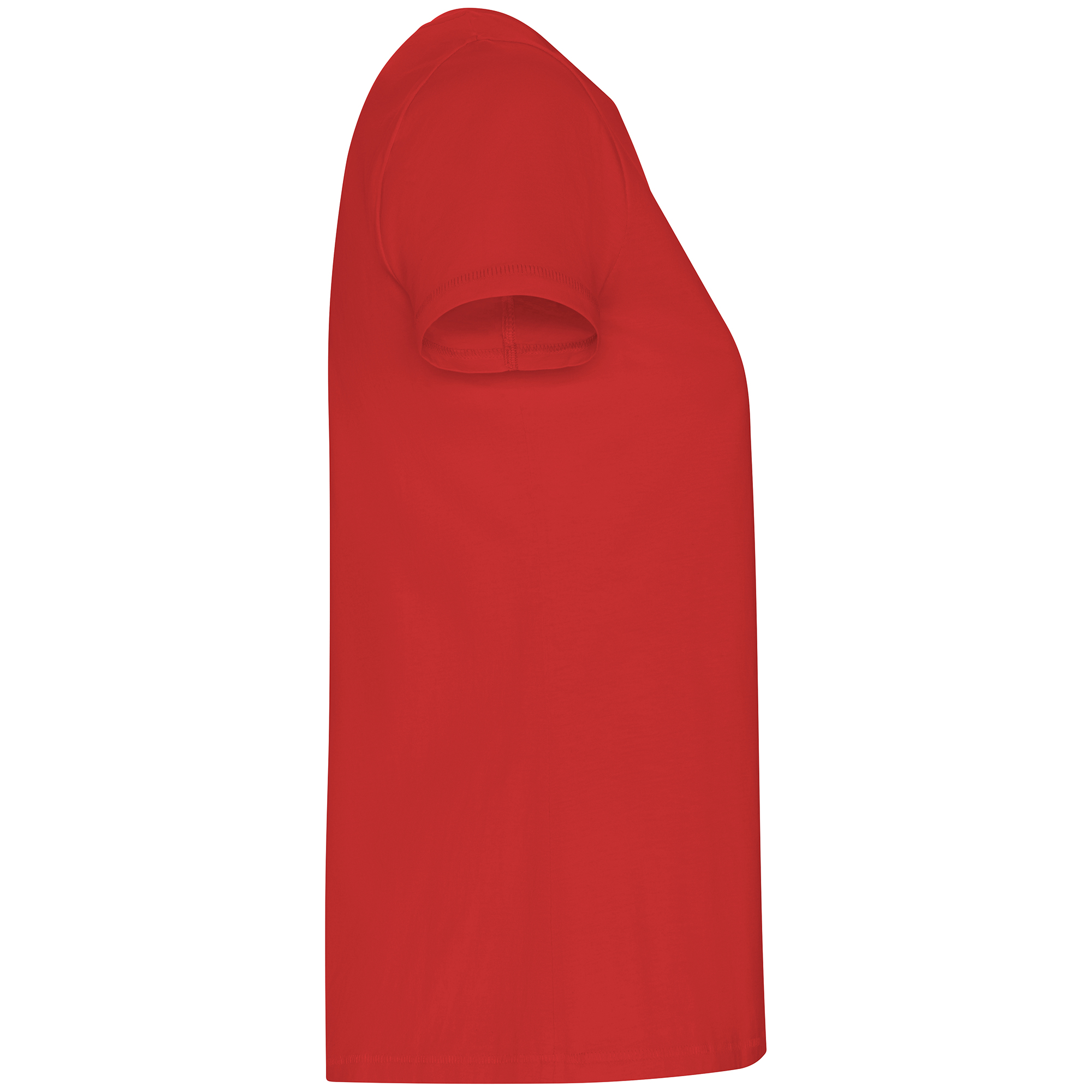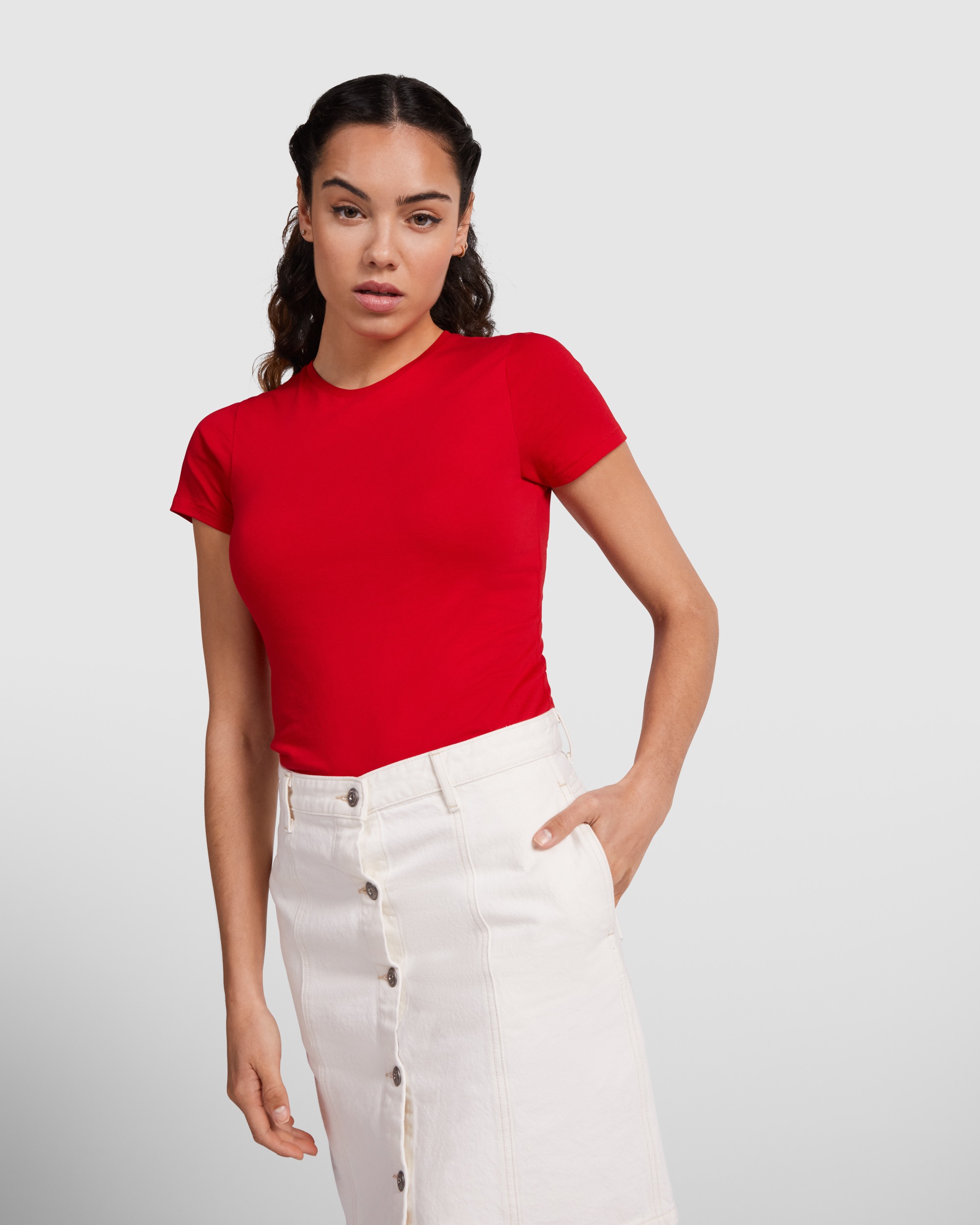 Tricou cambrat cu mânecă scurtă din bumbac pieptănat organic cu certificare GOTS. Guler rotund cu nervuri 1×1. Cu bandă asortată întărită pentru acoperirea cusăturii la guler. Cusături decorative asortate. Certificat GOTS.