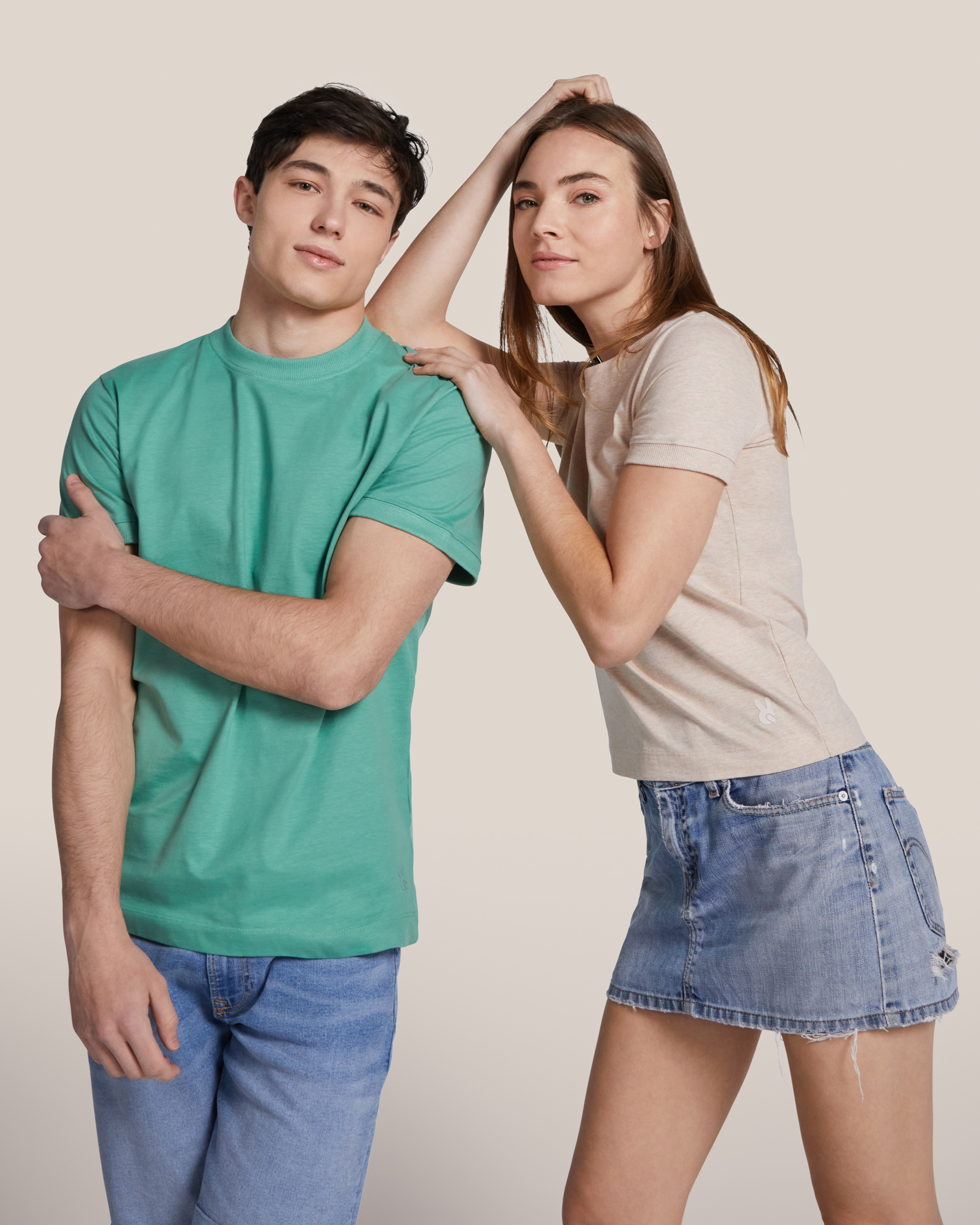 Tricou gros cu mânecă scurtă pentru femei din bumbac. Decolteu rotund larg 2×1 și manșete cu striații. Cusături acoperite întărite la guler. Cusături laterale. Logo Roly asortat pe tivul lateral stâng. Cusătură lată pe tiv.
