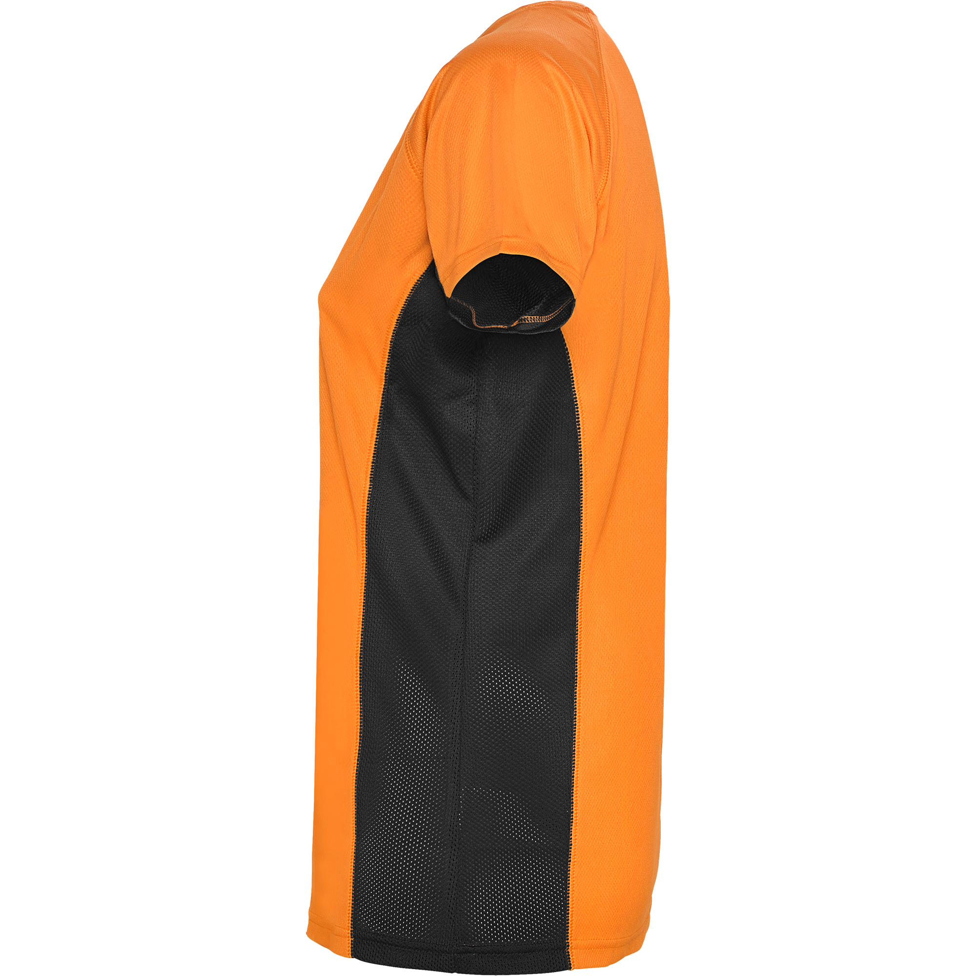 Tricou tehnic respirabil în două nuanțe, cu mâneci scurte. Panouri laterale din material micro-perforat. Guler rotund și bandă interioară asortate cromatic.
