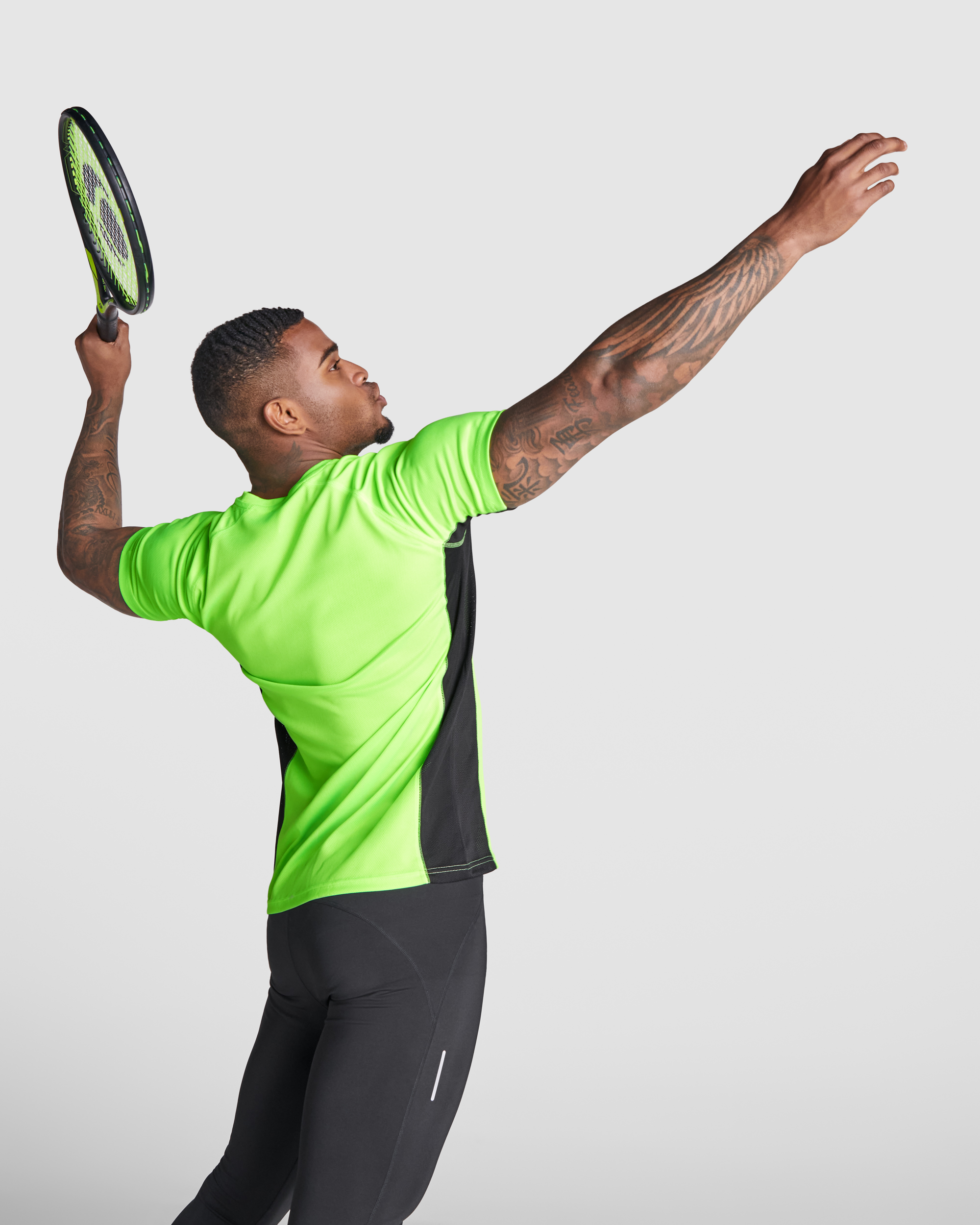Tricou tehnic cu mâneci raglan, respirabil, în două nuanțe. Panouri laterale din material micro-perforat. Guler rotund și bandă interioară asortate cromatic.