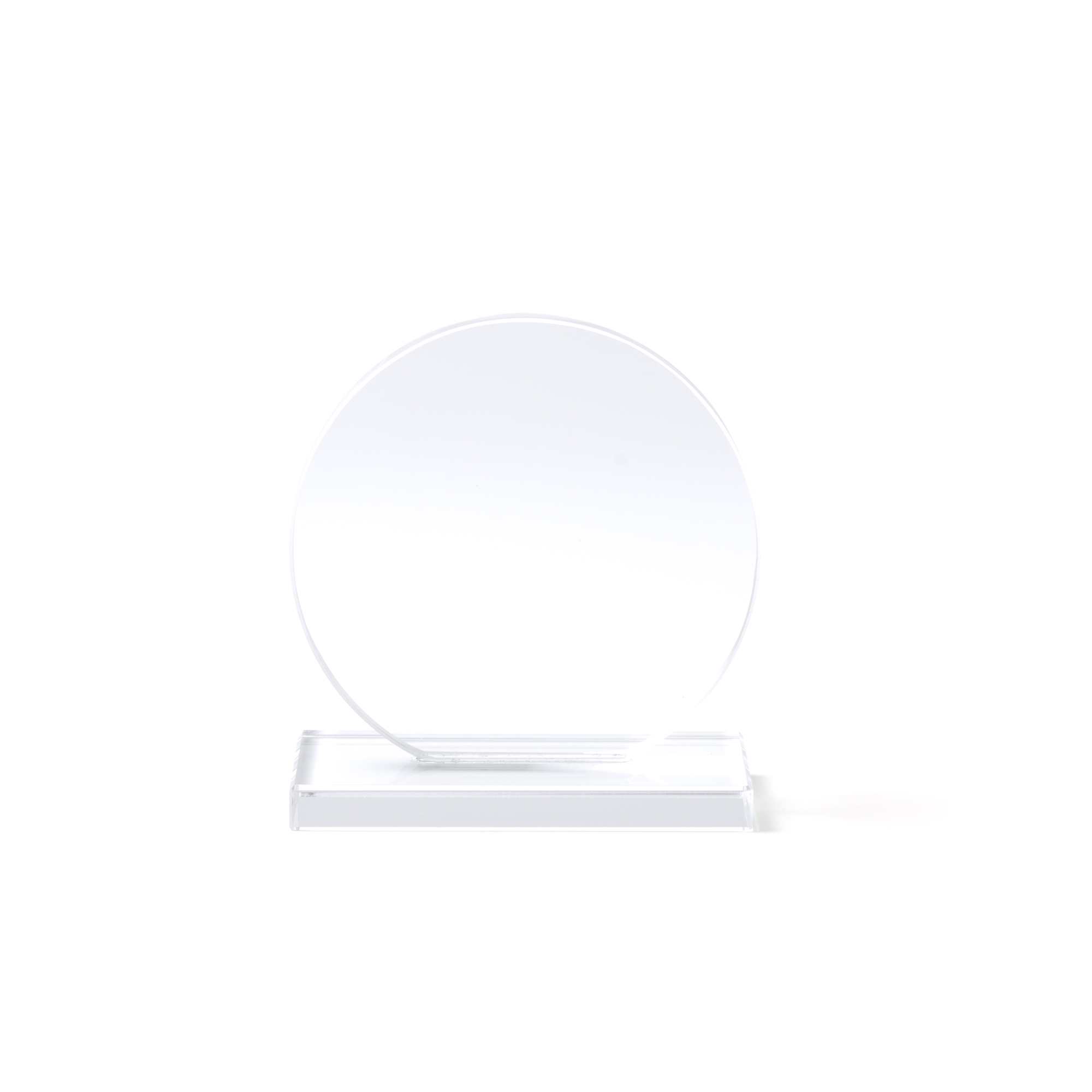 Trofeu din sticlă cu design circular și bază dreptunghiulară. Include carcasă de prezentare neagră.