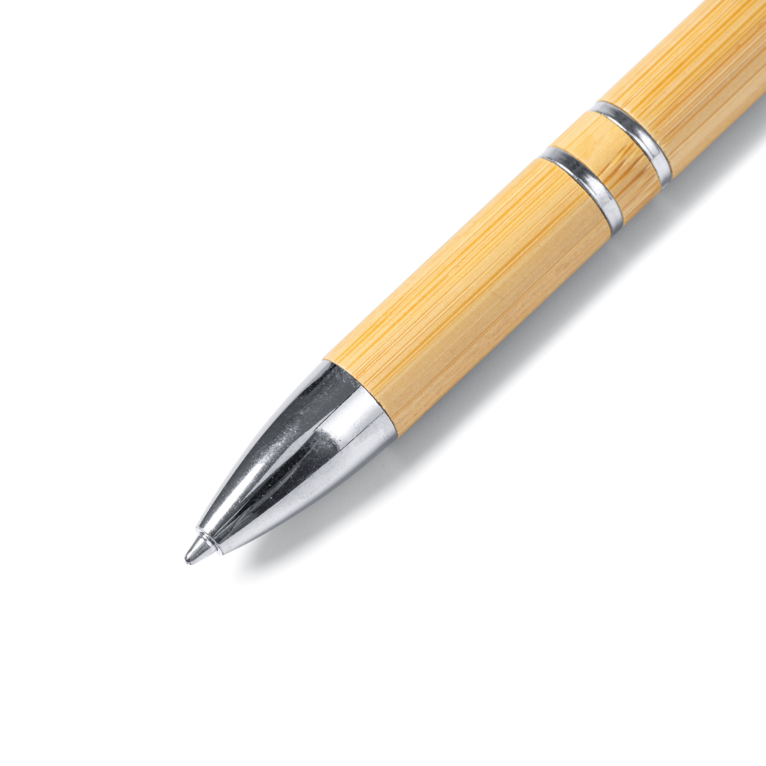 Stilou cu corp din bambus și buton cu finisaj metalic. Cerneală albastră, reumplere jumbo.