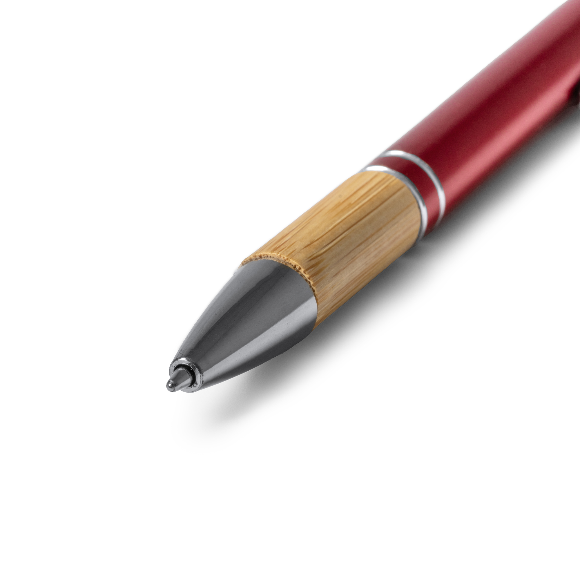 Corpul metalic îi conferă un aspect sofisticat și durabil, în timp ce mânerul din bambus adaugă o notă unică și naturală. Combinația acestor materiale creează un contrast atrăgător din punct de vedere vizual și un confort în timpul scrierii.