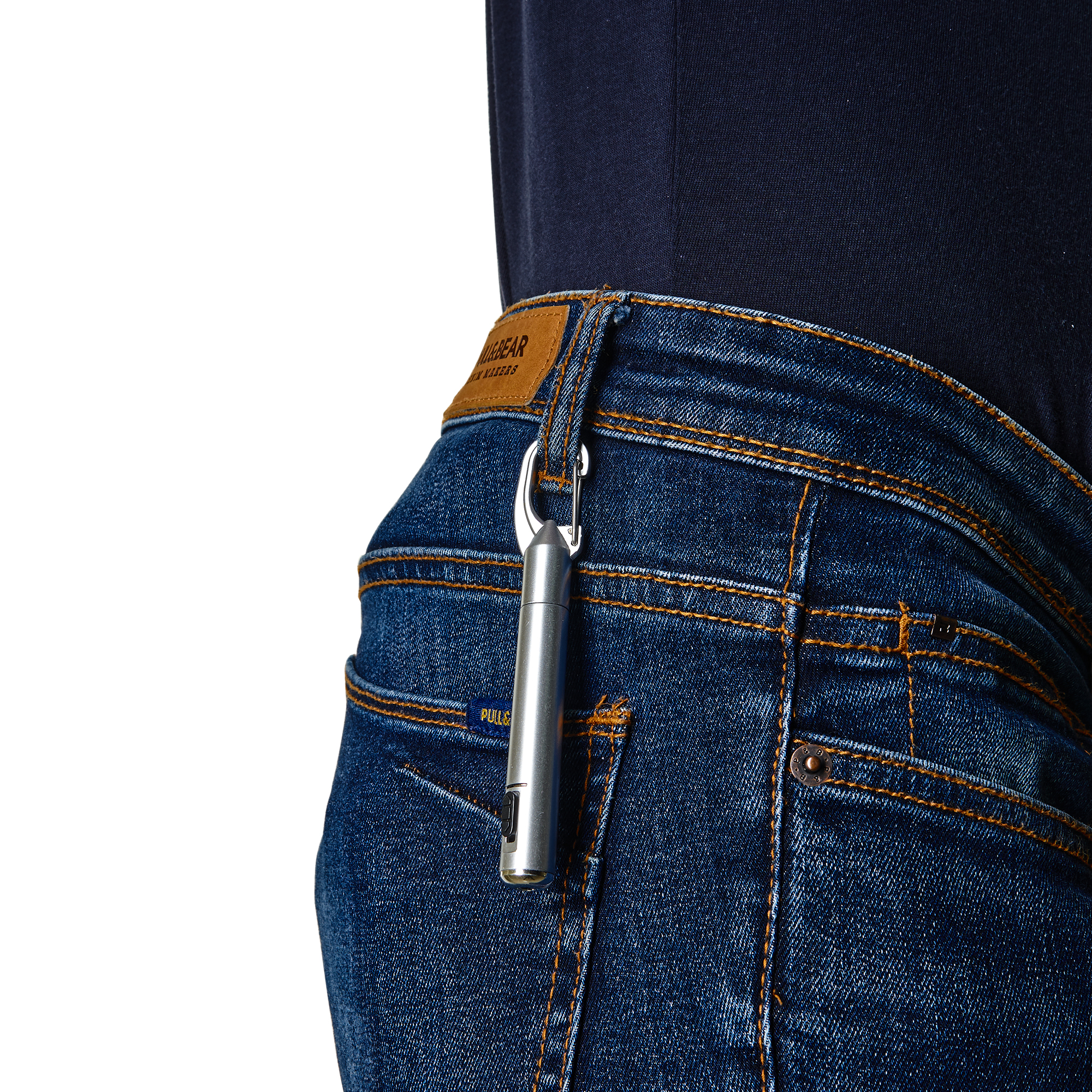 Pix cu lanternă cu lumină LED, disponibil în diverse culori cu finisaj metalic și buton negru. Carabină integrată în capac. Mină albastră.