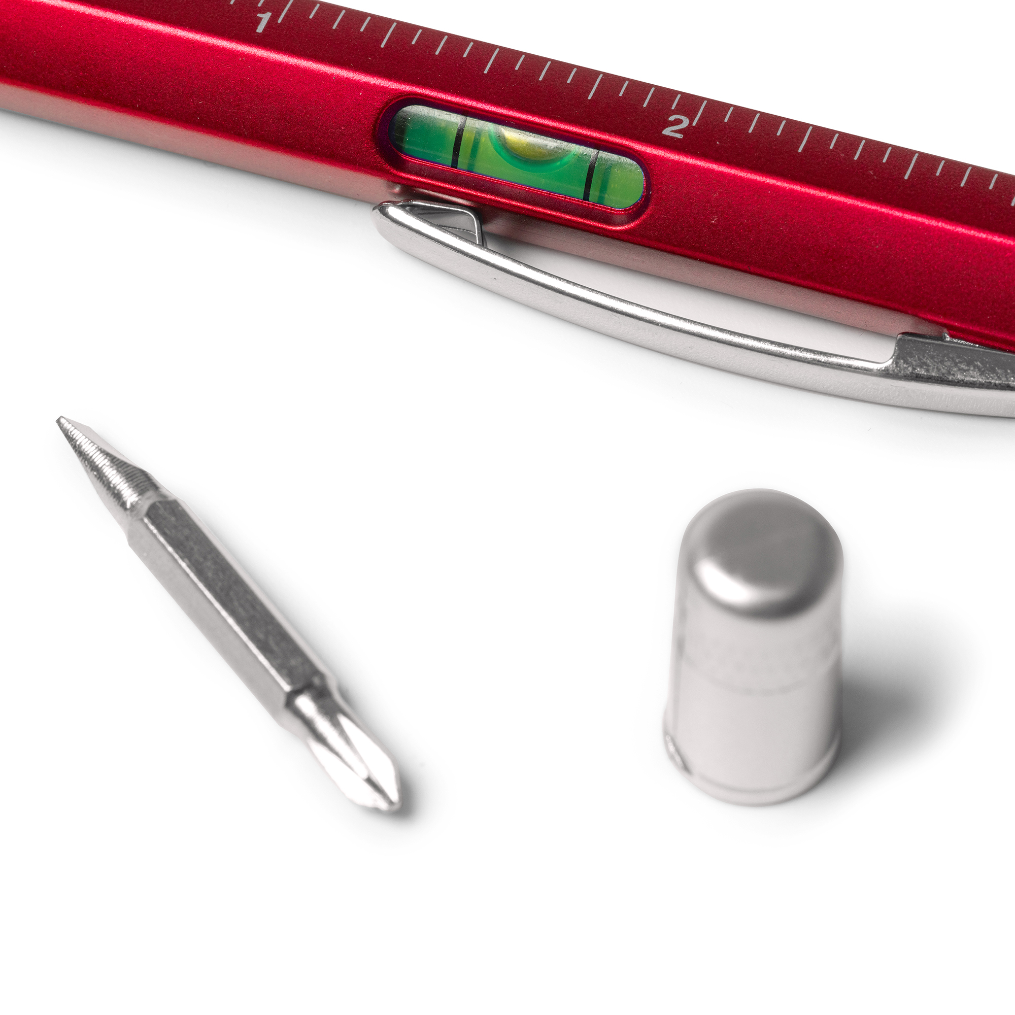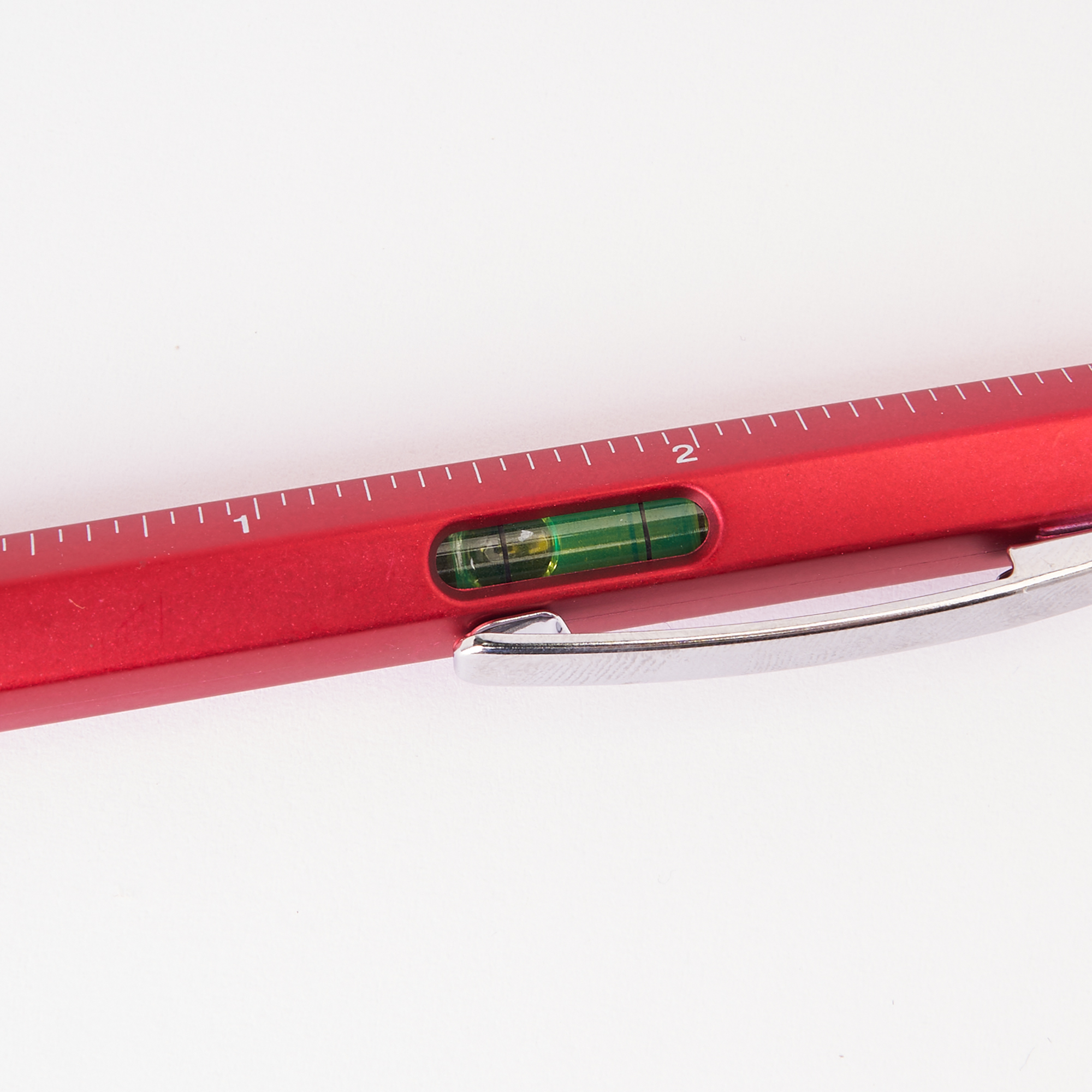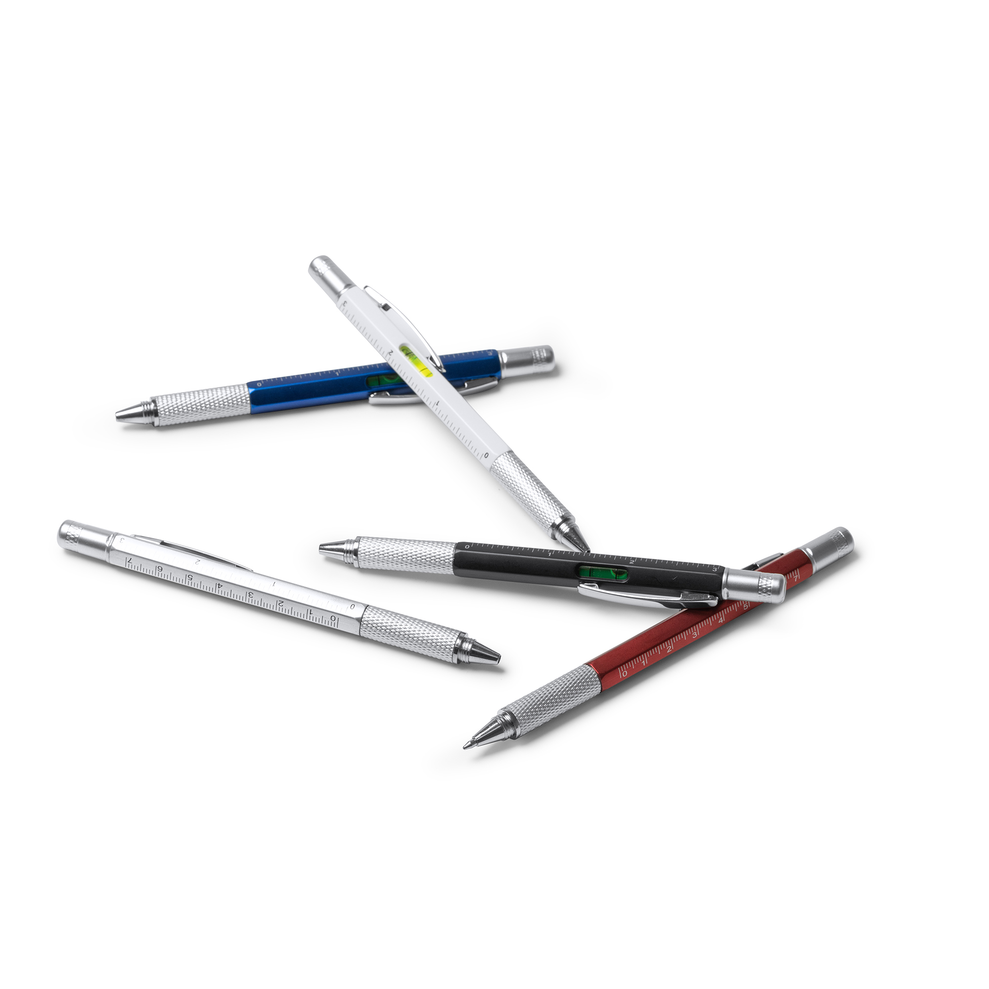 Pix multifuncțional cu următoarele instrumente: nivel, riglă în centimetrii și inchi, șurubelniță normală și șurubelniță stea. Corp disponibil în diferite culori. Mecanism rotativ. Mină albastră.